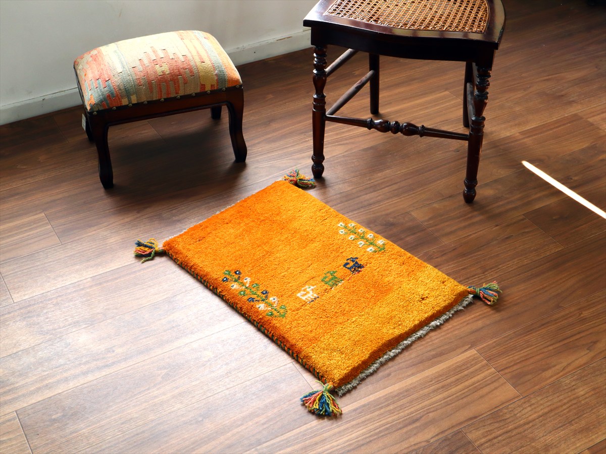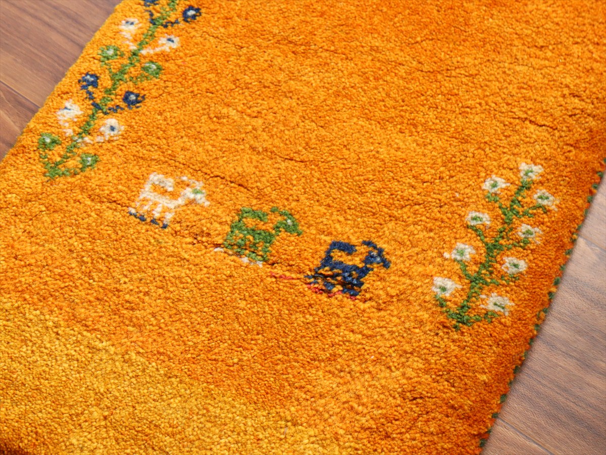 Key:ギャッベ,ギャベ,一点もの 現品販売 ラグ,ウール製,イラン,手織り,じゅうたん,絨毯,座布団, イエロー オレンジ 黄色 草木染, ガラタバザール Gabbeh, Handmade, Hand knotted, Tribal rug, Iran carpet, Wool, Natural Dye,