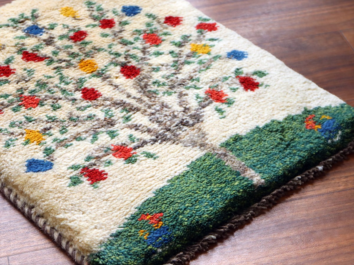ギャッベ ミニギャベ イラン手織り 53×41cm ナチュラルアイボリー 生命の樹とザクロと動物