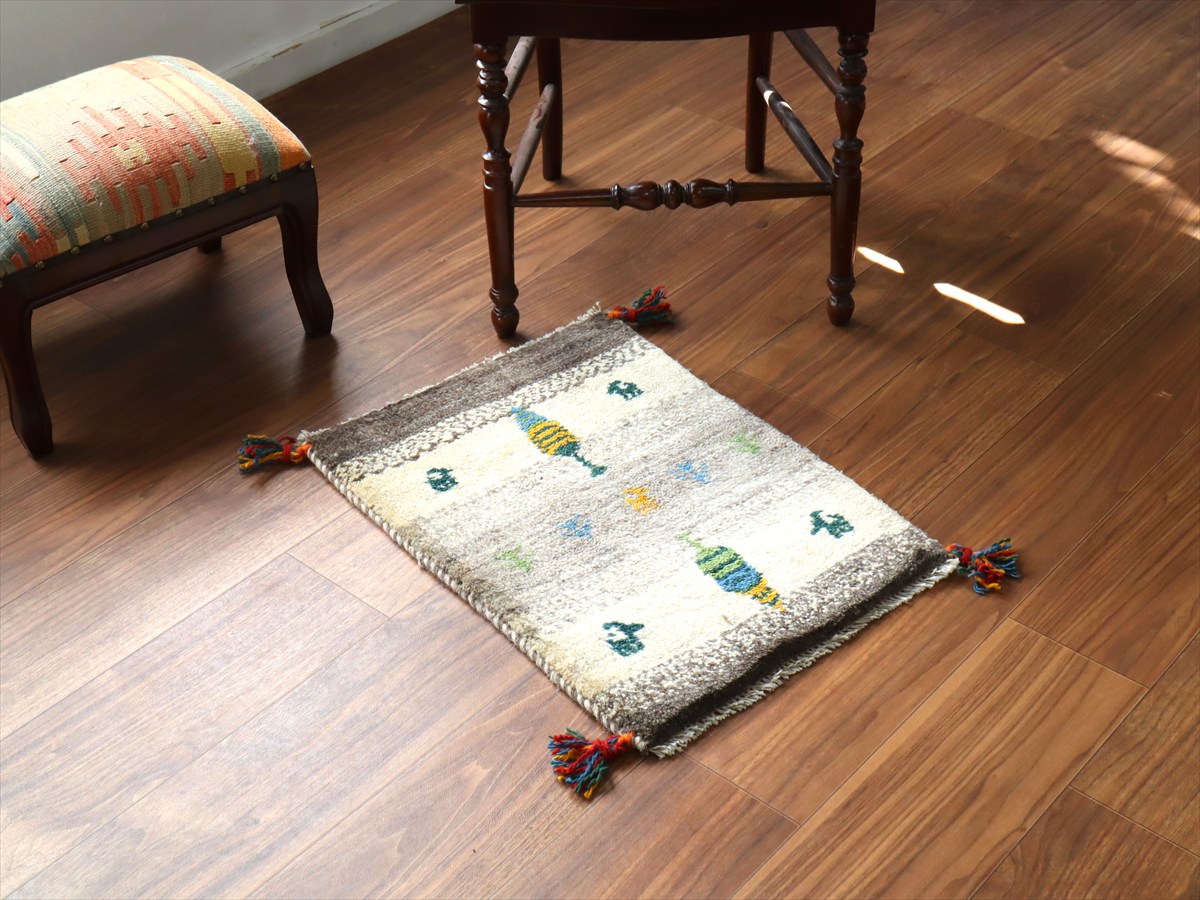 ギャッベ ミニギャベ イラン手織り 57×42cm ナチュラルアイボリー 糸杉と動物