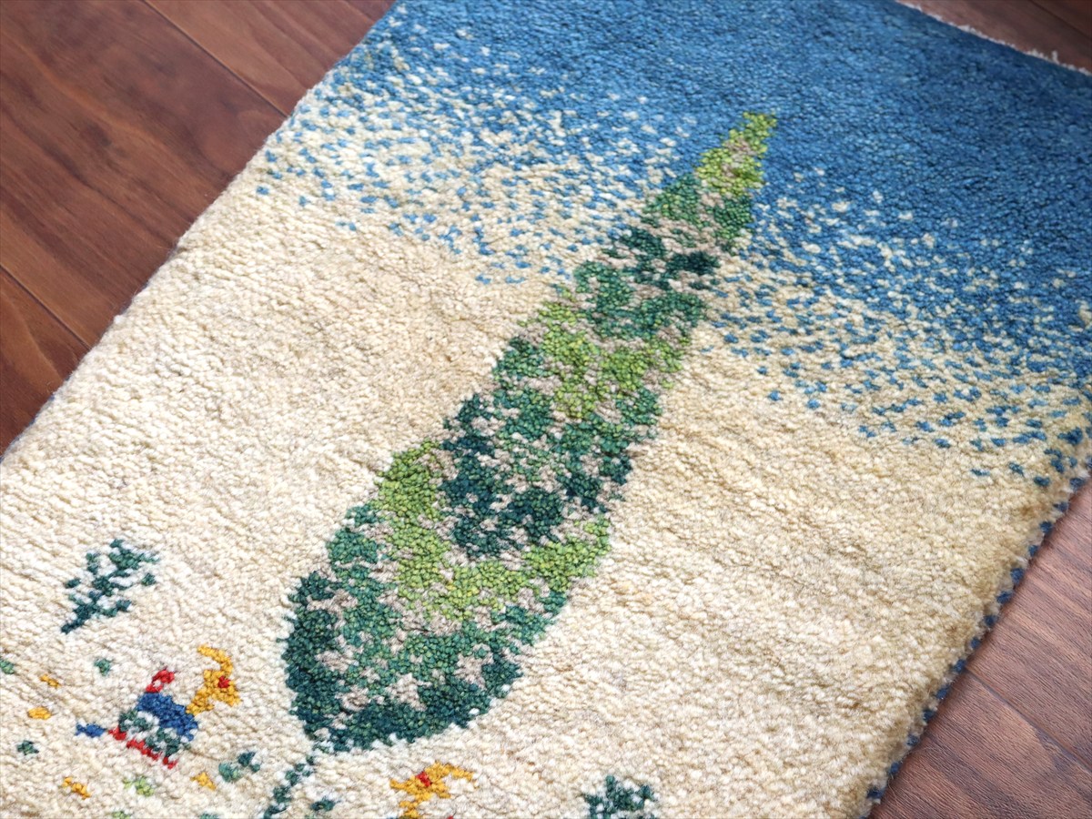 天然の羊毛の色をそのまま使ったアイボリーのギャッベ。ところどころグレーやベージュの毛糸も混ざっています。空をイメージしたブルーと糸杉が織られています。糸杉は長寿を願う意味を持っていて、ギャベでは多用されるモチーフのひとつです。動物モチーフも織られています。
