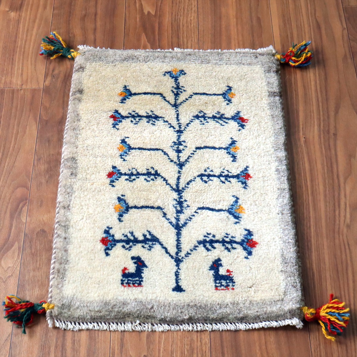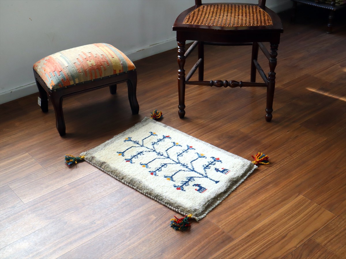- ギャッベ ミニギャベ イラン手織り 57×40cm ナチュラルアイボリー 生命の樹と動物