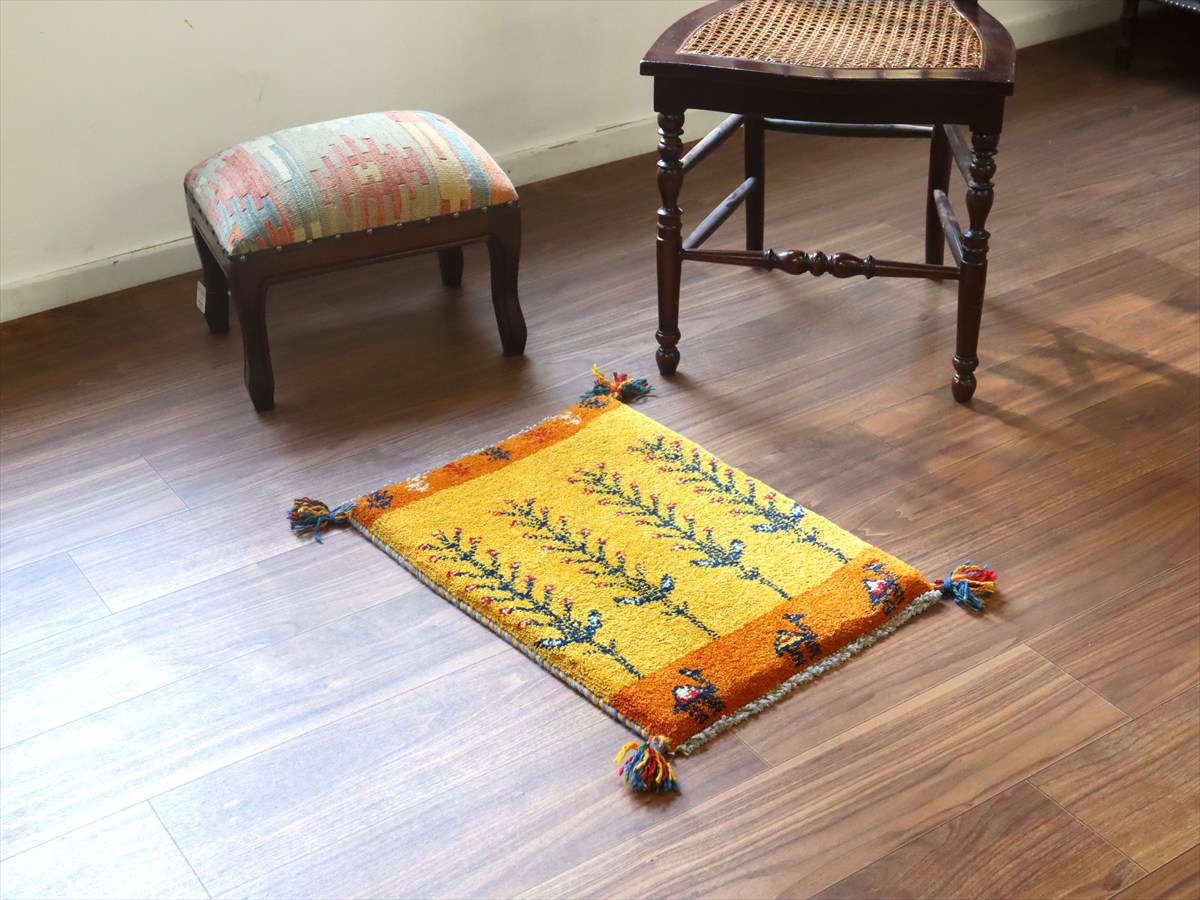 ギャッベ ミニギャベ イラン手織り 56×41cm イエローオレンジ 連なる生命の樹とラクダ