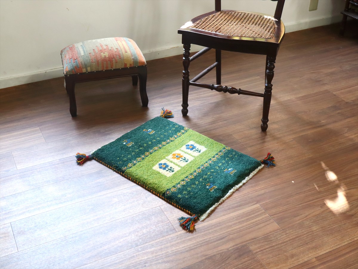 - ギャッベ ミニギャベ イラン手織り 58×43cm グリーン フラワーと動物