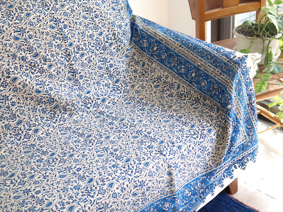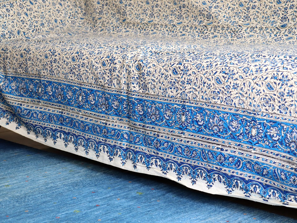 ペルシャ更紗・イラン手染め布/236x153cm ソファーカバー・テーブルクロス ブルー系フラワー柄