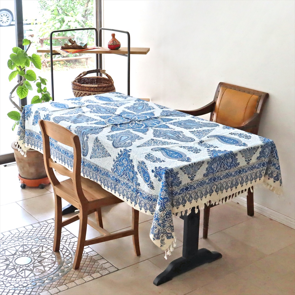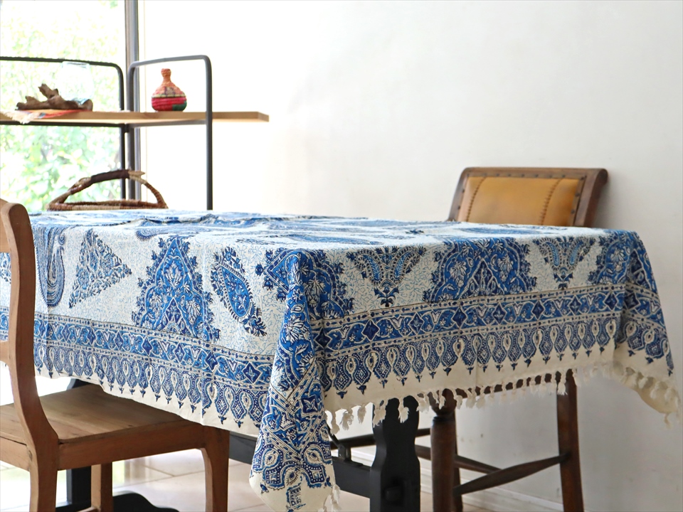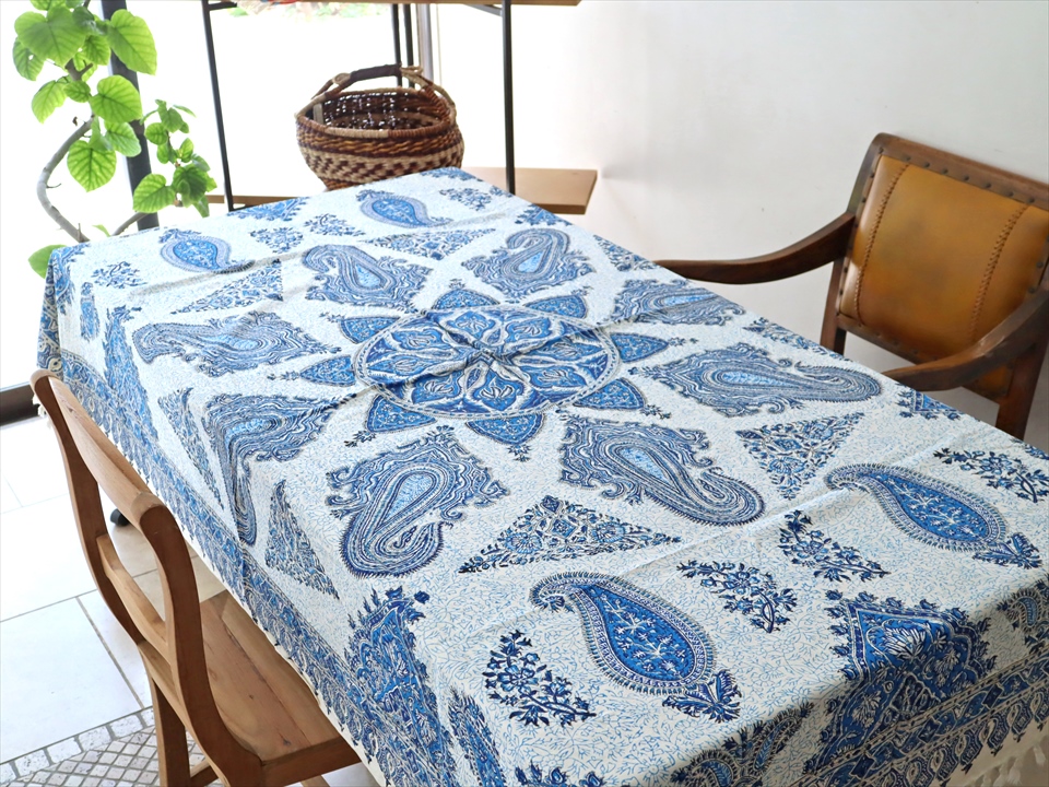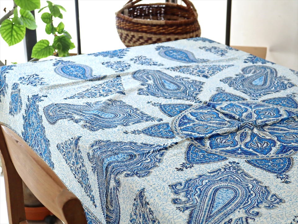ペルシャ更紗・イラン手染め布 190x110cm ブルー系ペイズリー柄 テーブルクロス・ソファカバー