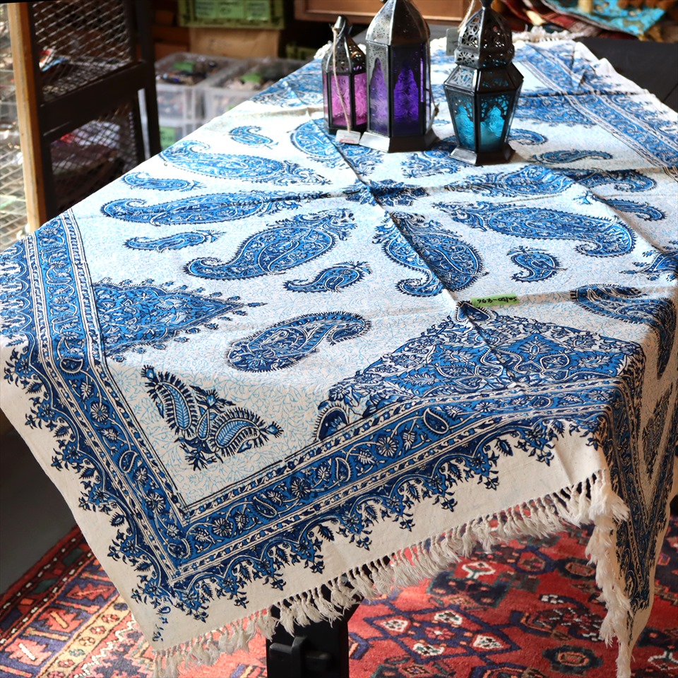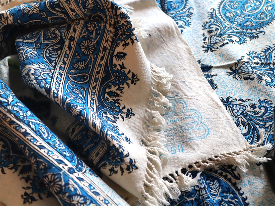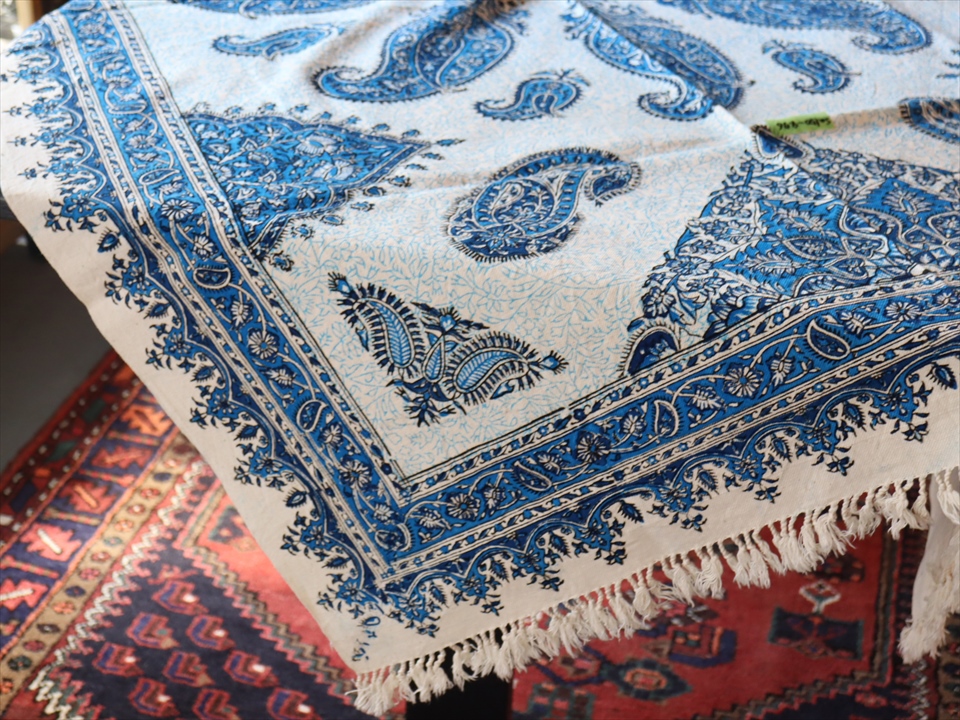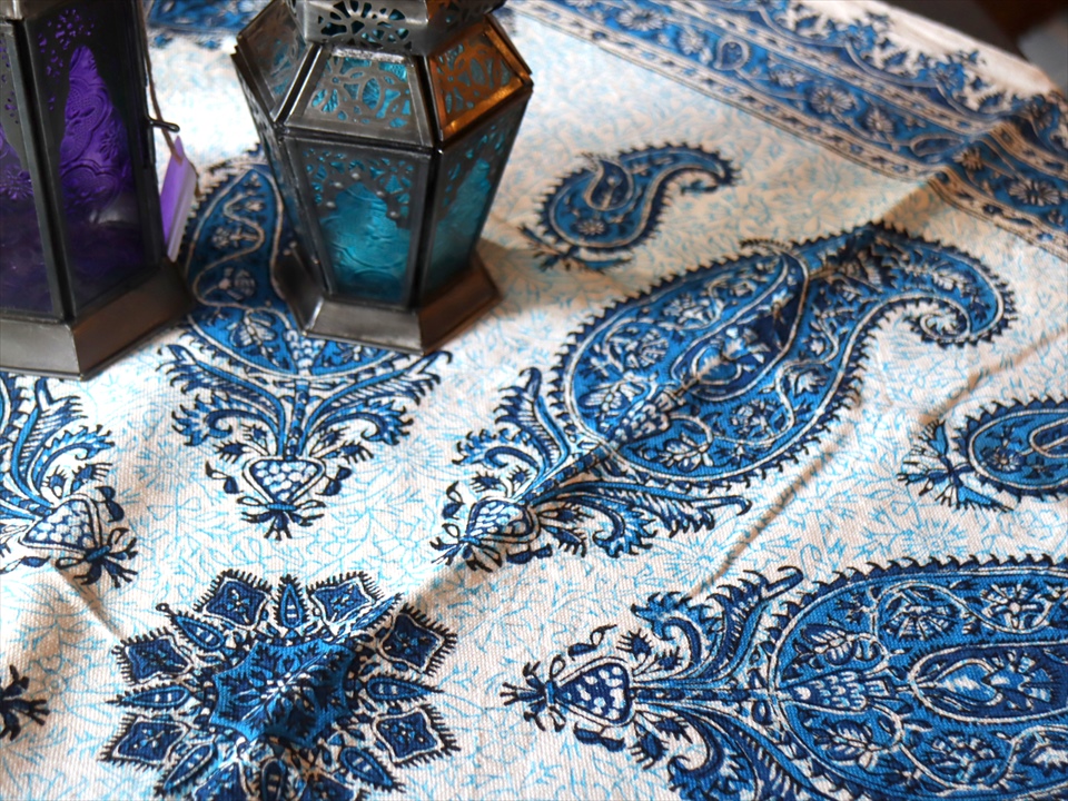 Key:コットン 染色 ブロックプリント 木版 捺染 伝統工芸 ペルシャブルー ペイズリー フリークロス マルチカバー ベッドスプレッド ベッドカバー ソファカバー カーテン タペストリー ファブリック インテリアファブリック クラフト インテリア ペルシャ ペルセポリス イラン 中東 シルクロード アジアン エスニック