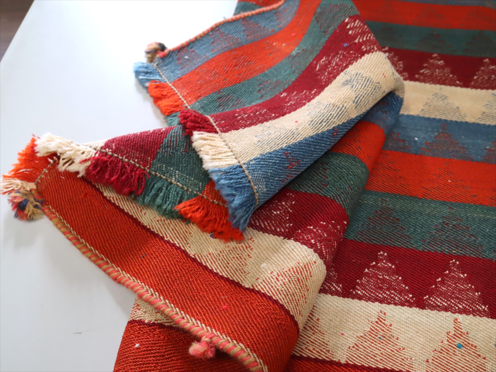 カシュカイ族の織るキリムは一般的にトルコキリムより厚みがありがっちりとした質感です。織り地は厚みがあり、ぎゅっと目が詰まって、固くしっかりとしています。