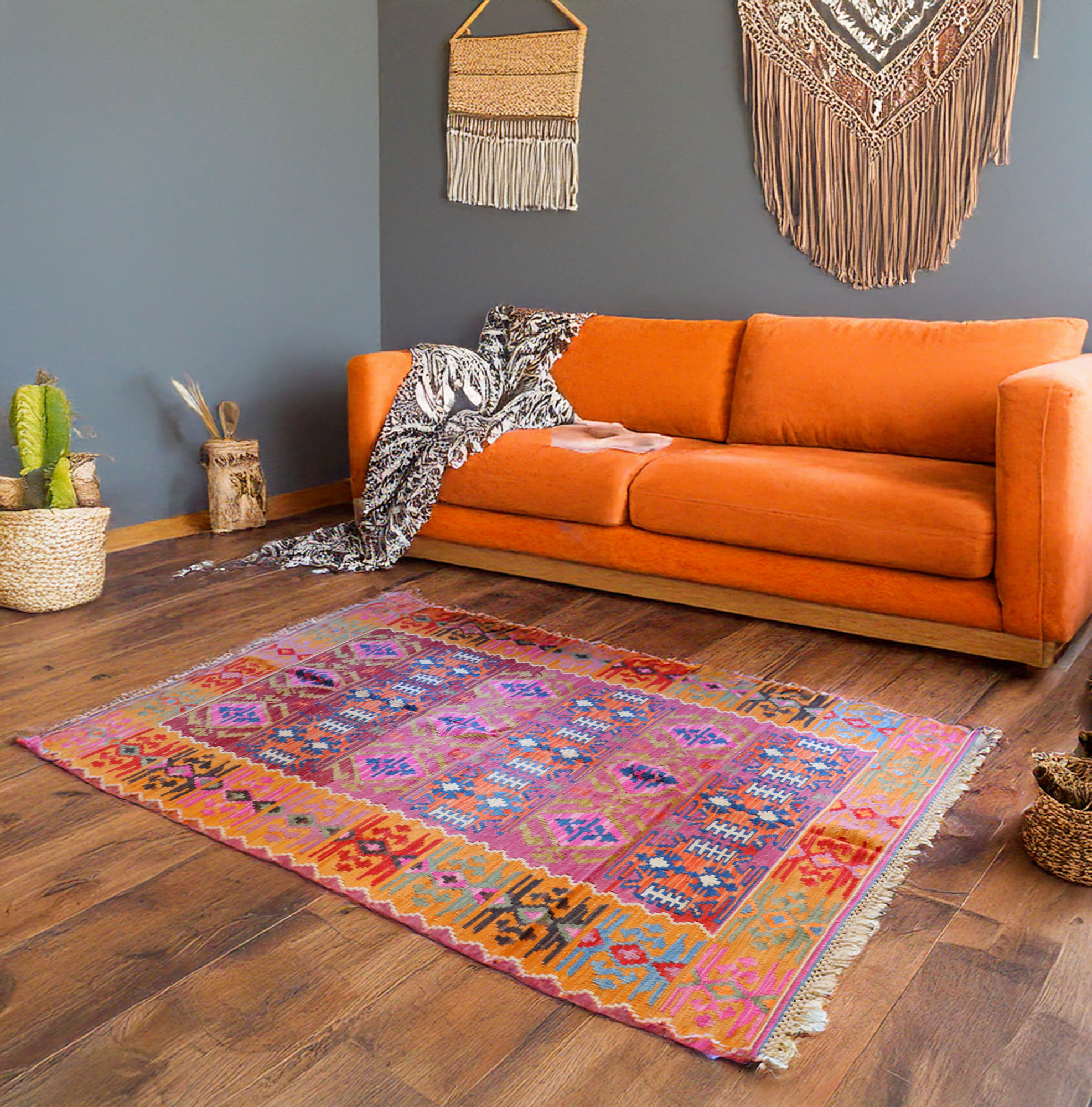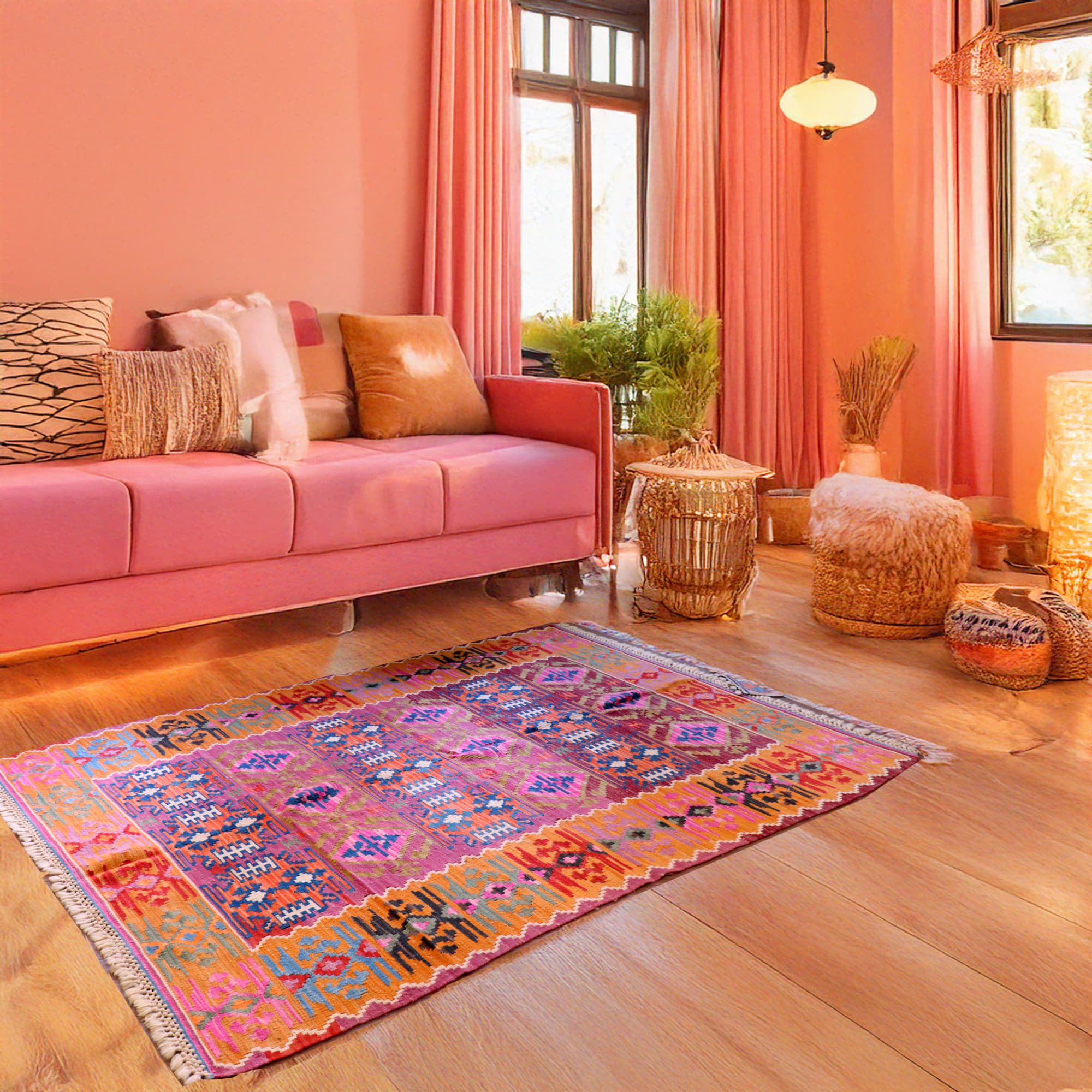 手織りキリム トルコ カイセリ産221×153cm リビングサイズ ローズピンクとオレンジ サンドゥック