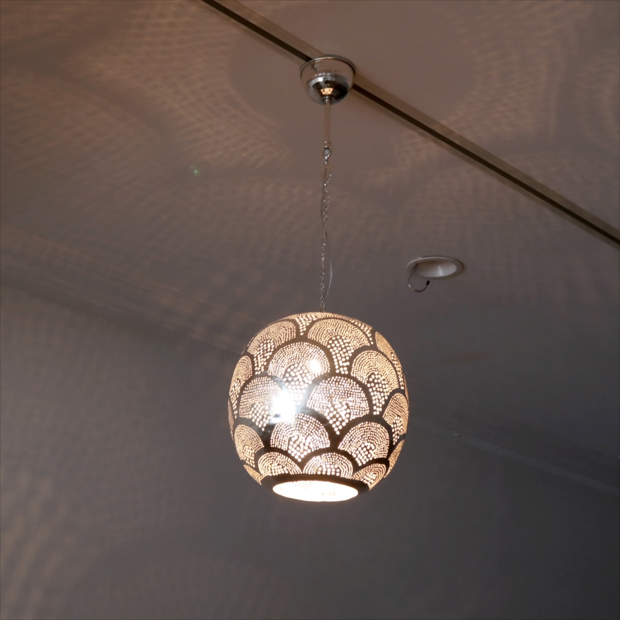 メタルを薄く加工し、コンコンと小さな穴をあけて光をデザインするランプシェードを作りました。中世から作られて来た伝統的な技法で、細工からこぼれる光が壁に映り、エキゾチックな雰囲気を楽しめます。