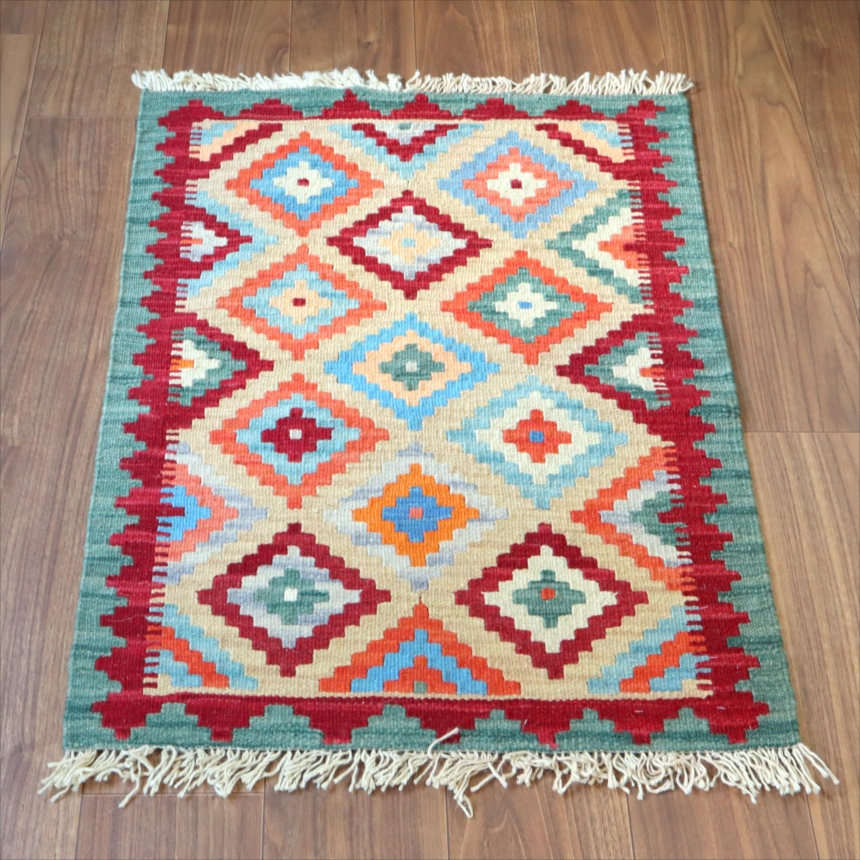 - 手織りキリム イラン シラーズ86×63cm カラフルな幾何学モチーフ
