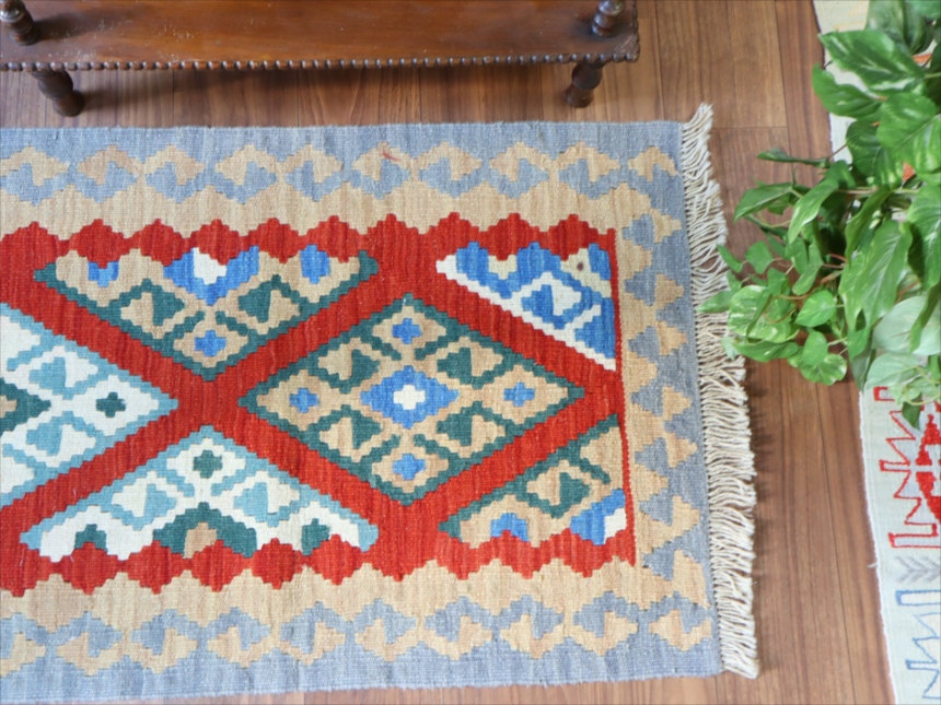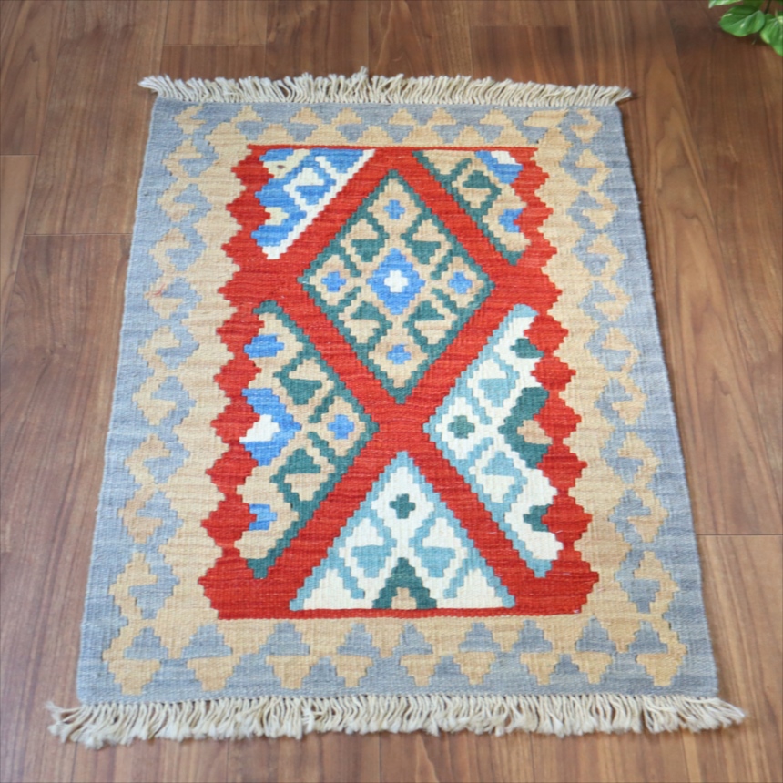 - 手織りキリム イラン シラーズ92×66cm カラフルな幾何学モチーフ