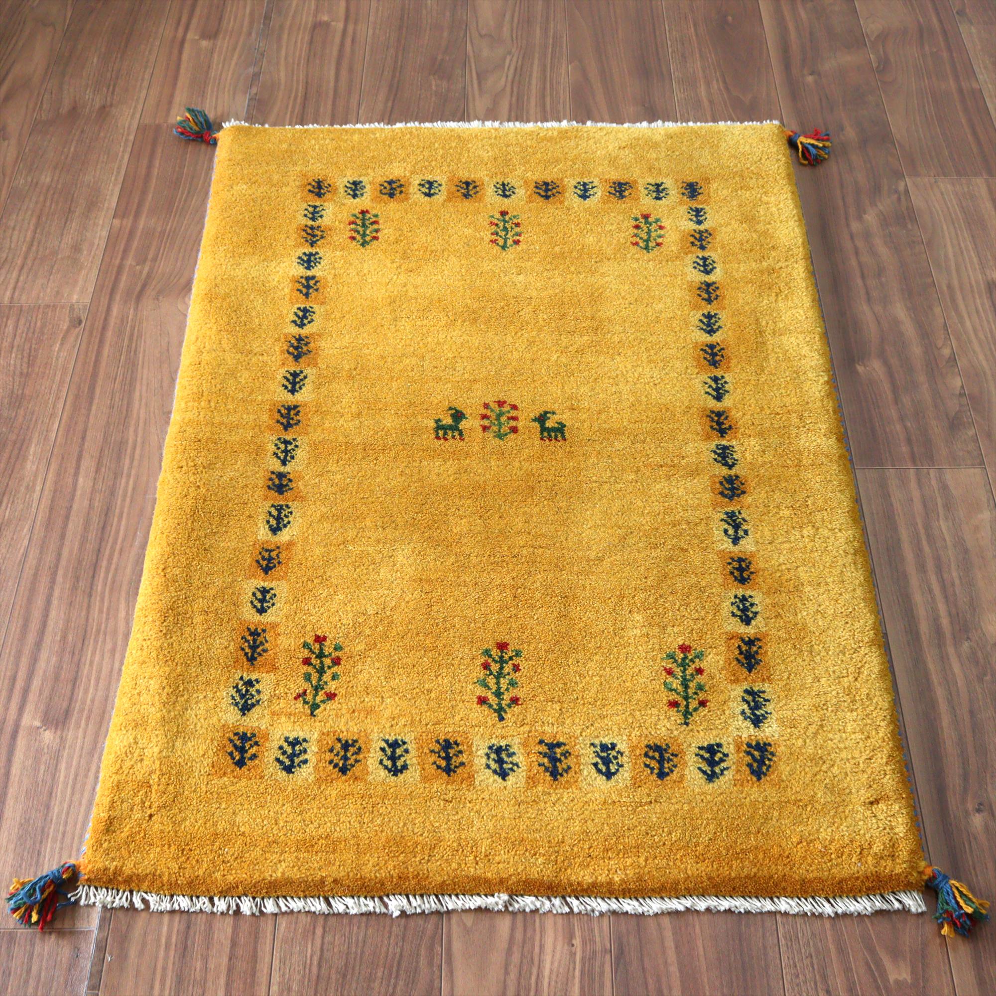 - イランの手織りラグ ギャッベ 118x79cm イエロー 生命の樹と動物