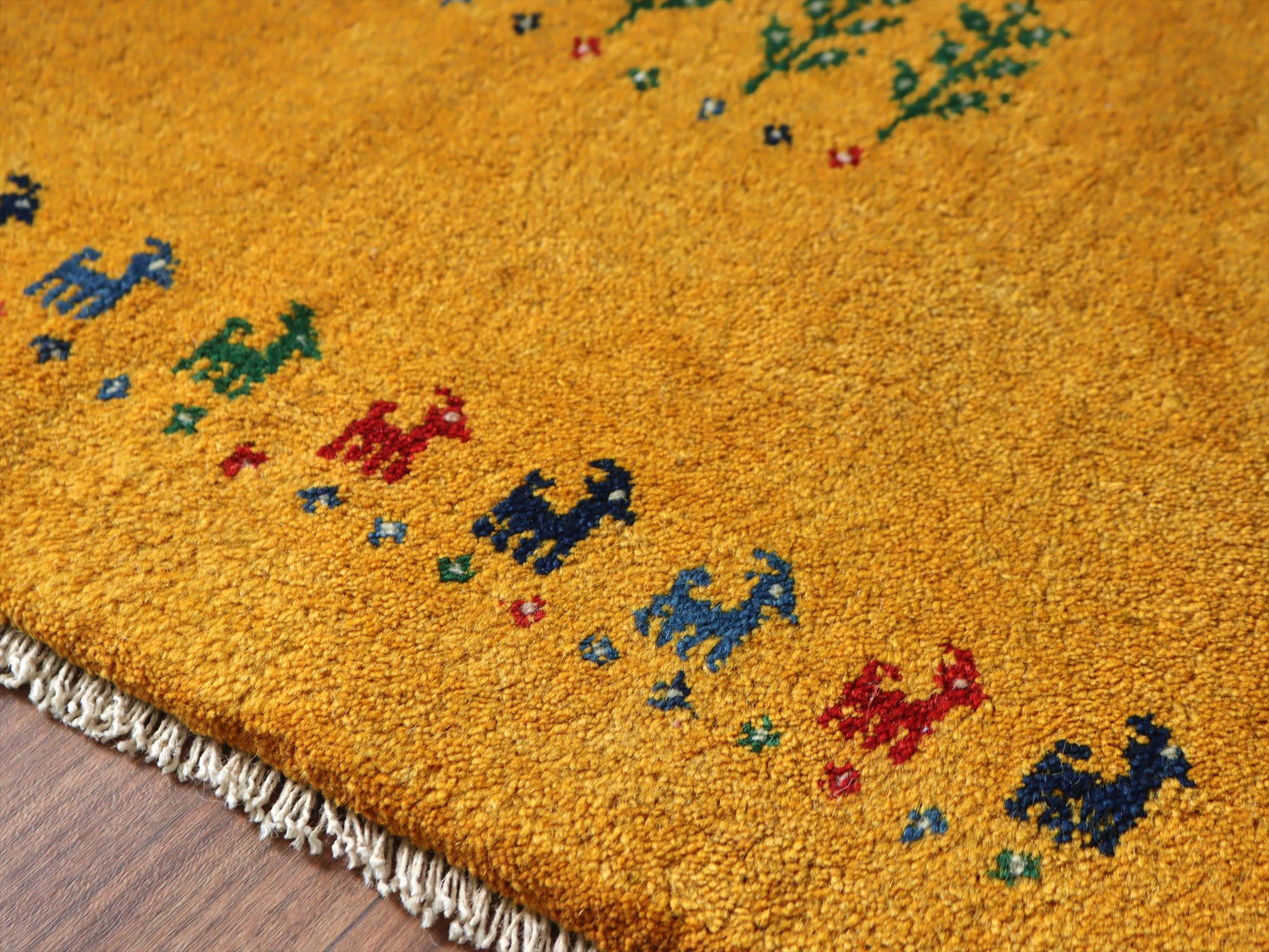 ギャッベ イランの手織りラグ 116x84cm 動物と生命の樹 イエロー