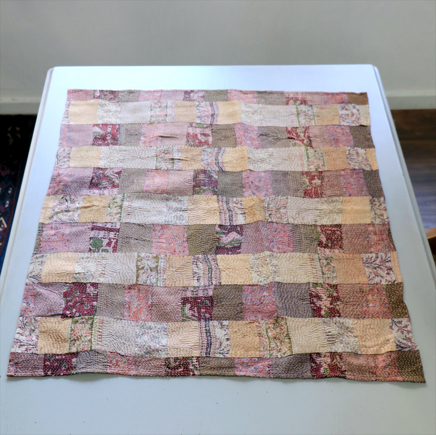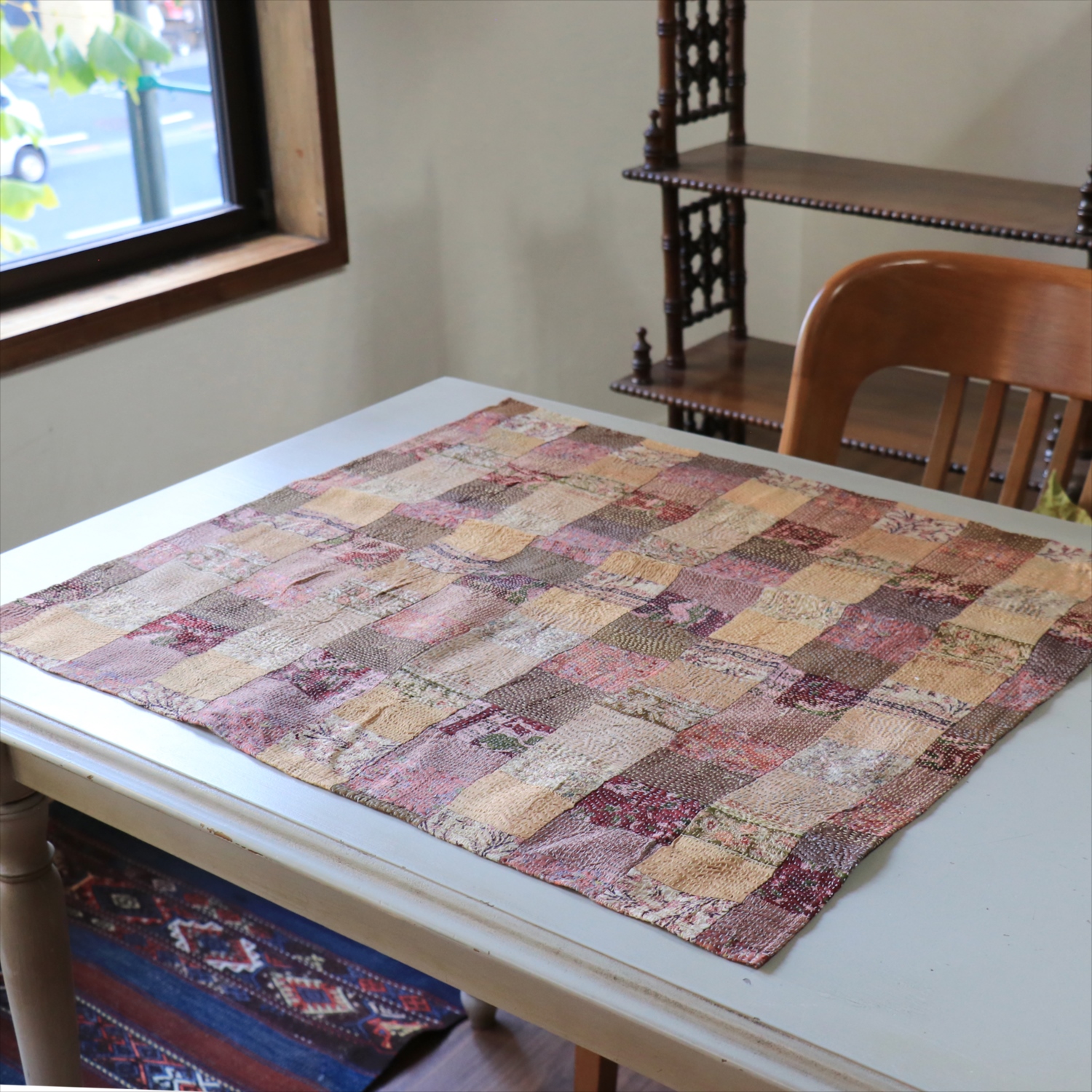 カンタ刺繍 シルク ミニクロス65×60cm<br>パッチワーク モーブ&ベージュ 両面リバーシブル