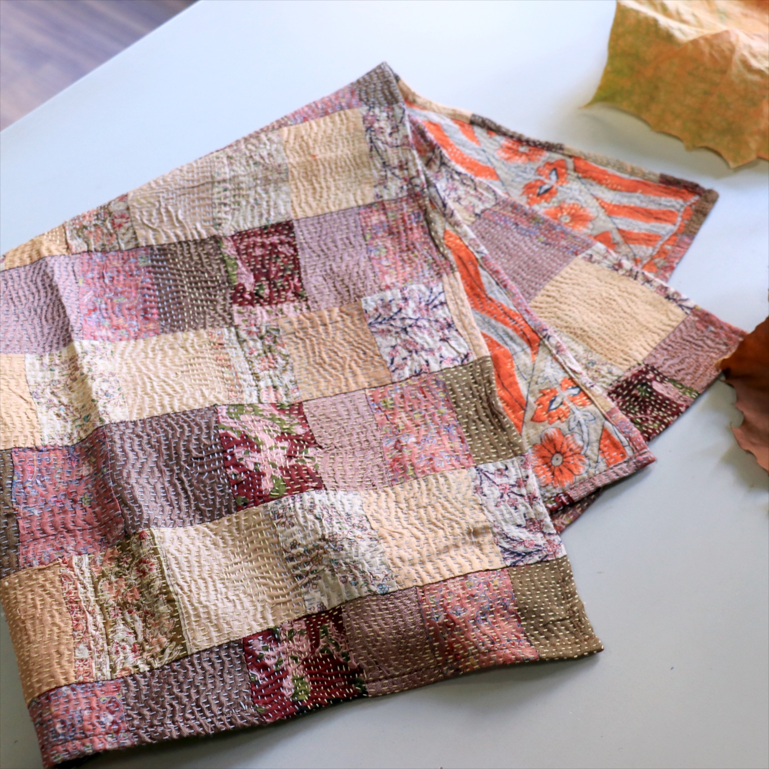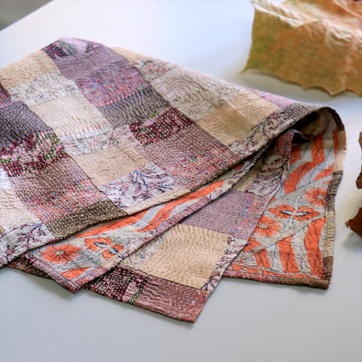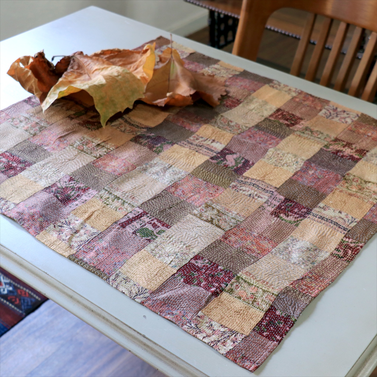 - カンタ刺繍 シルク ミニクロス65×60cm<br>パッチワーク モーブ&ベージュ 両面リバーシブル