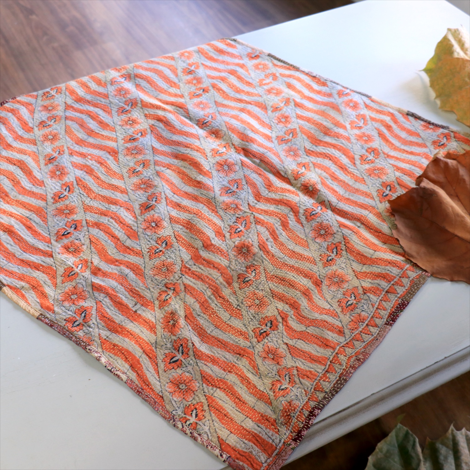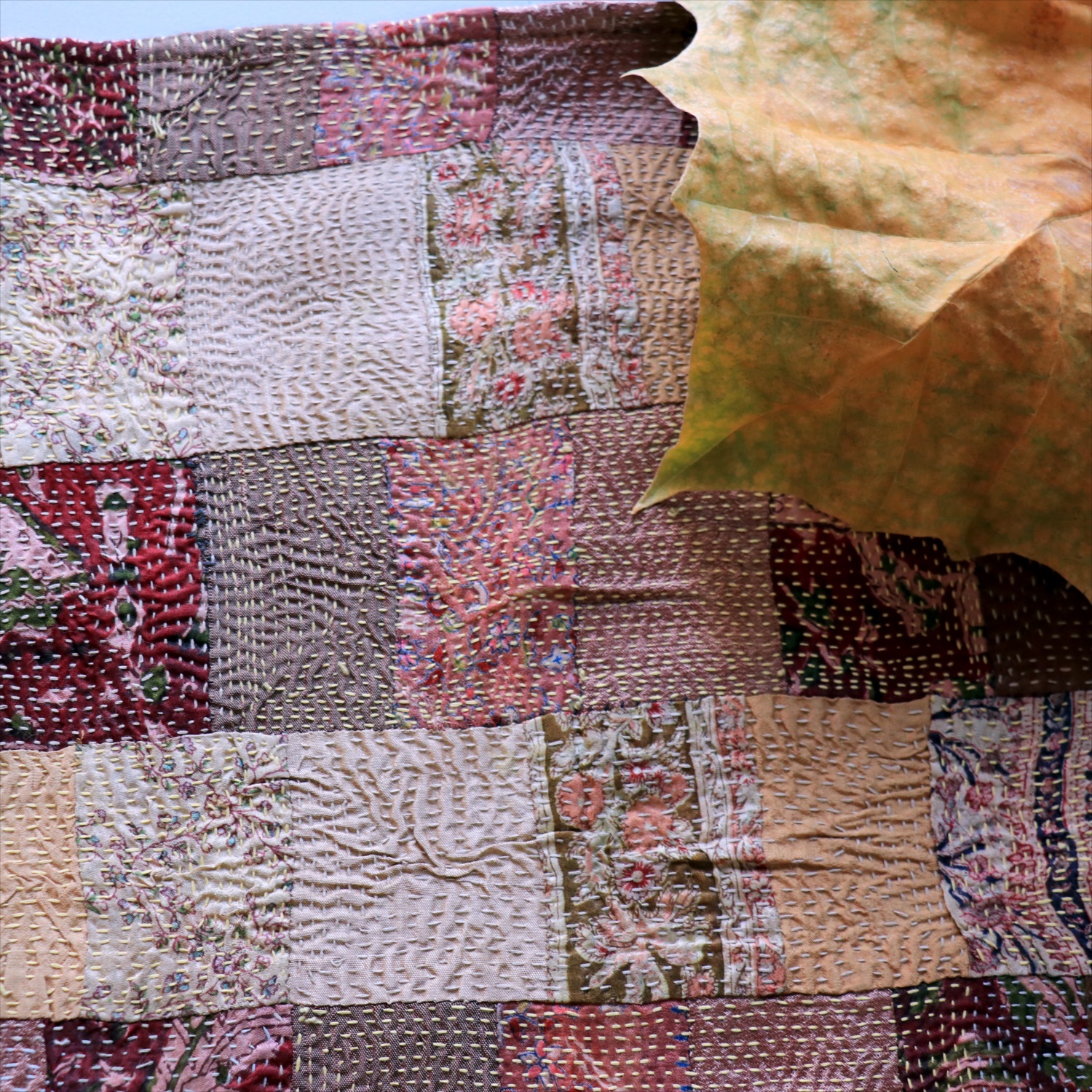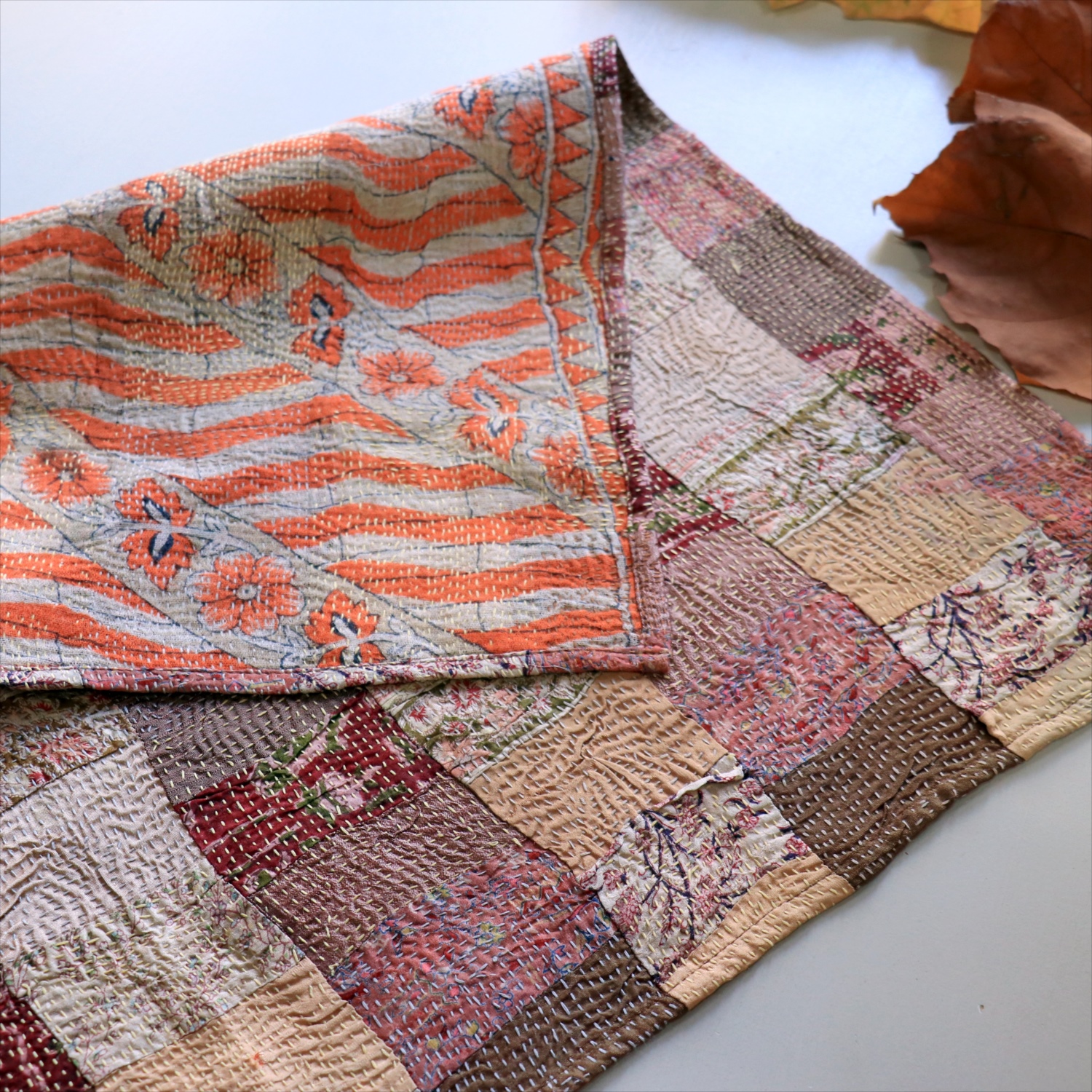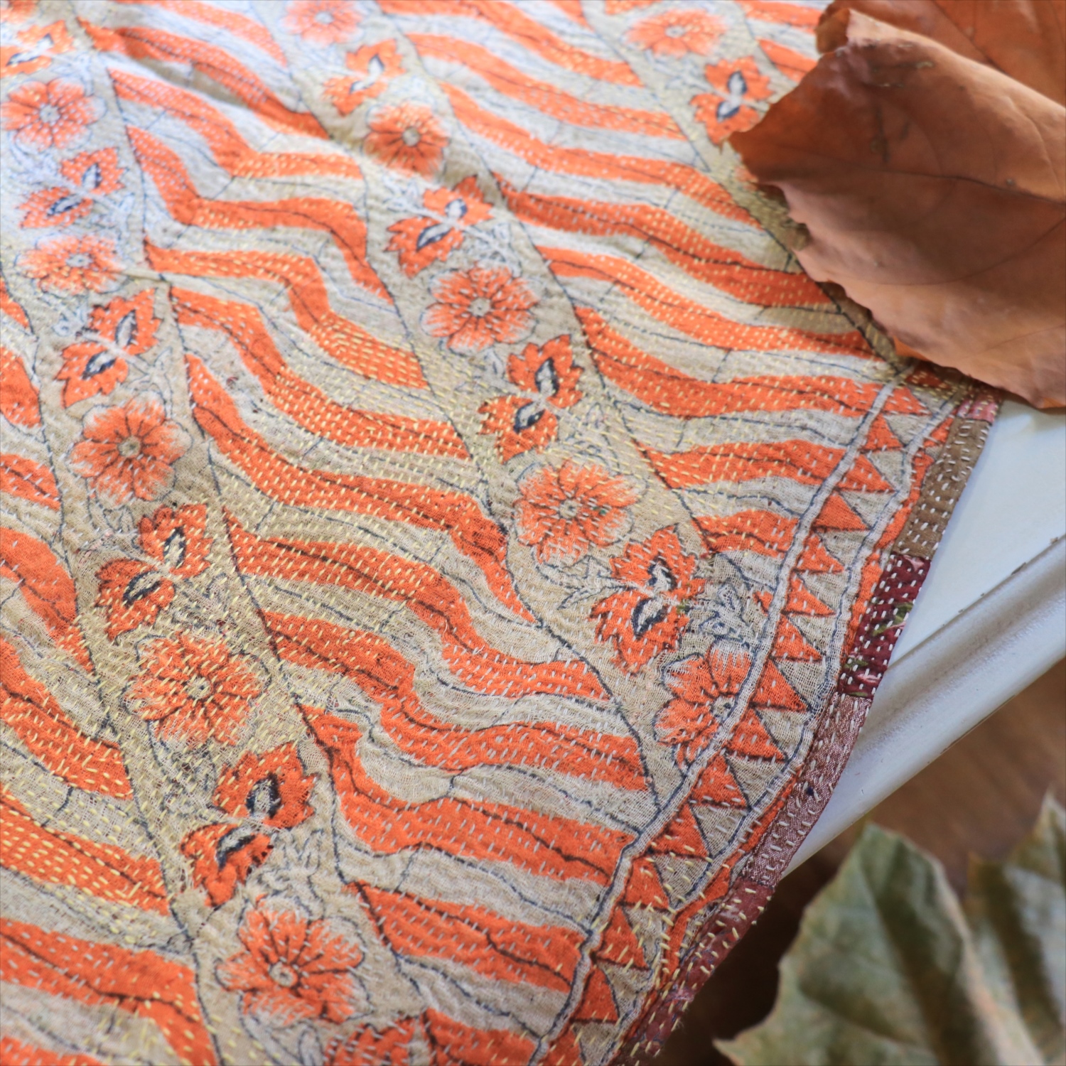 インド東部からバングラディシュにわたるベンガル地方で、古くから伝統的に作られてきた刺繍布。伝統的なものは、刺繍をするベースに古布が用いられ、ランニングステッチ(日本の刺し子に近い)で、シンプルなラインや時には小さなモチーフが表現されています。作られた布は、掛け布団(キルト加工がされる)、ショール、鏡カバー、その他生活の様々な道具として使われました。