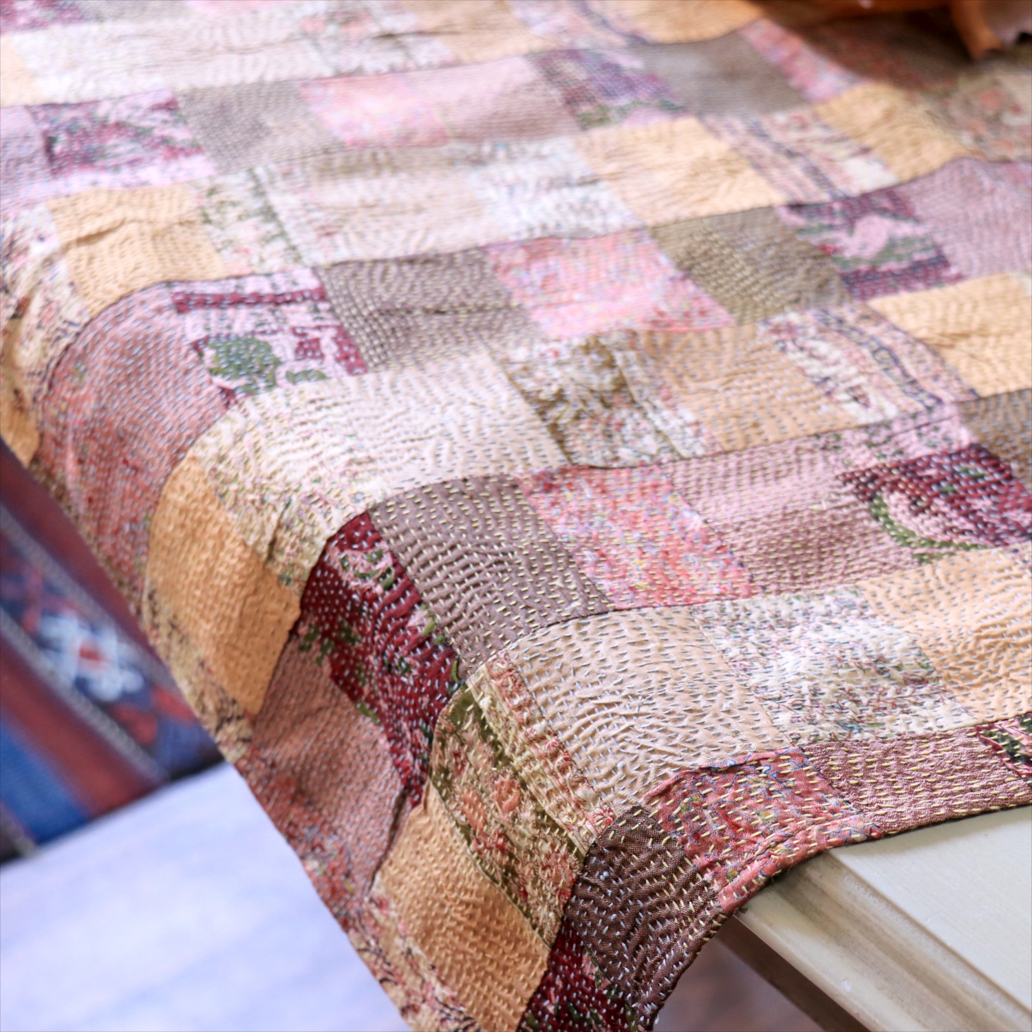 シルクのパッチワーク地に、丸いかたちの刺し子を施したカンタ刺繍の布です。ベースはサリー(女性の衣装)のリサイクルで、数種類の違う布を5cmくらいにカットして、それらを縫い合わせてつくられています。そしてその上から、使いやすく強度を増すためにコットンの糸で刺し子がほどこされています。細かなステッチを全面に施し、手間を惜しまず、根気よく針を進めて作られた布です。裏面は別のサリーの生地を貼り合わせてあり、両面別のイメージでどちらも使えます。