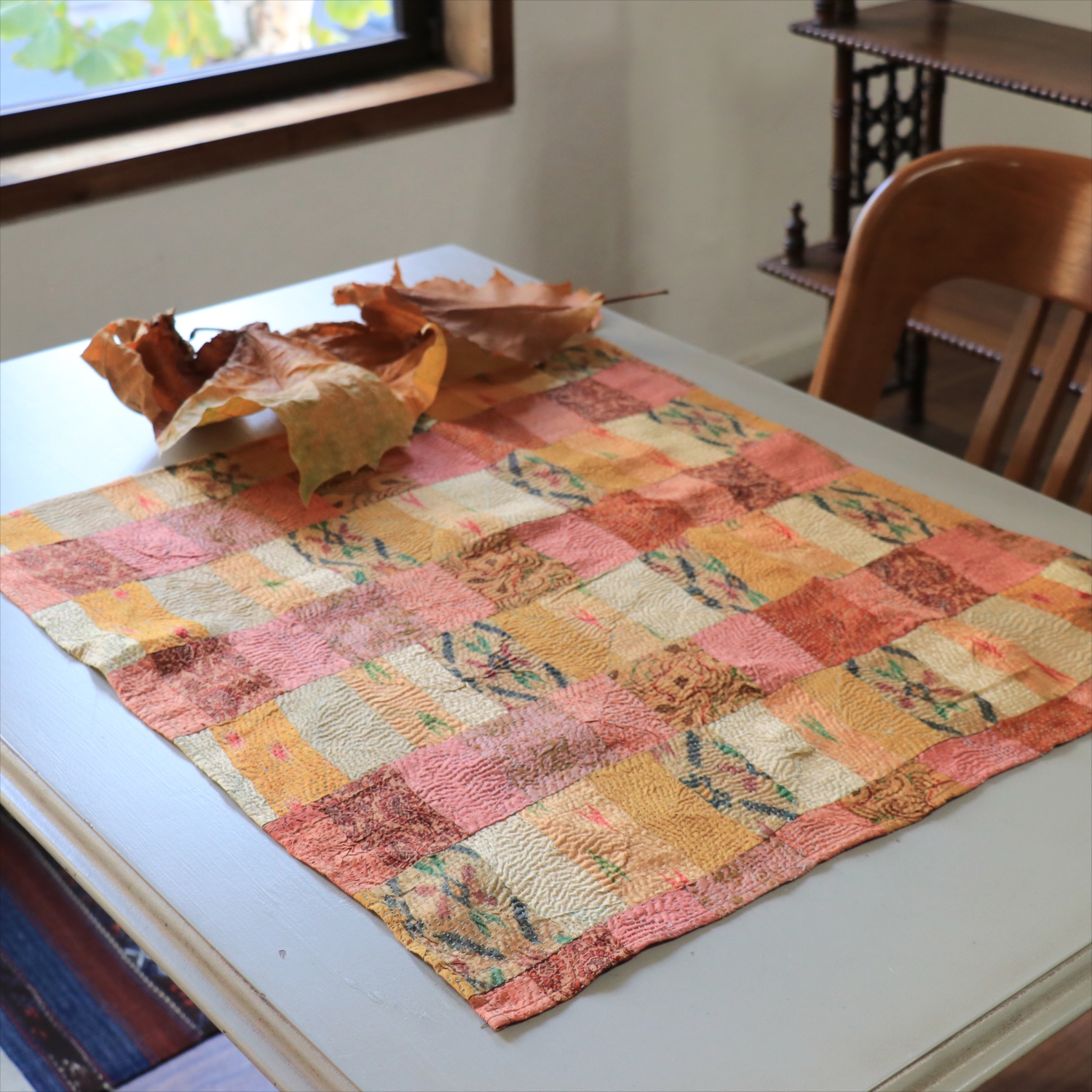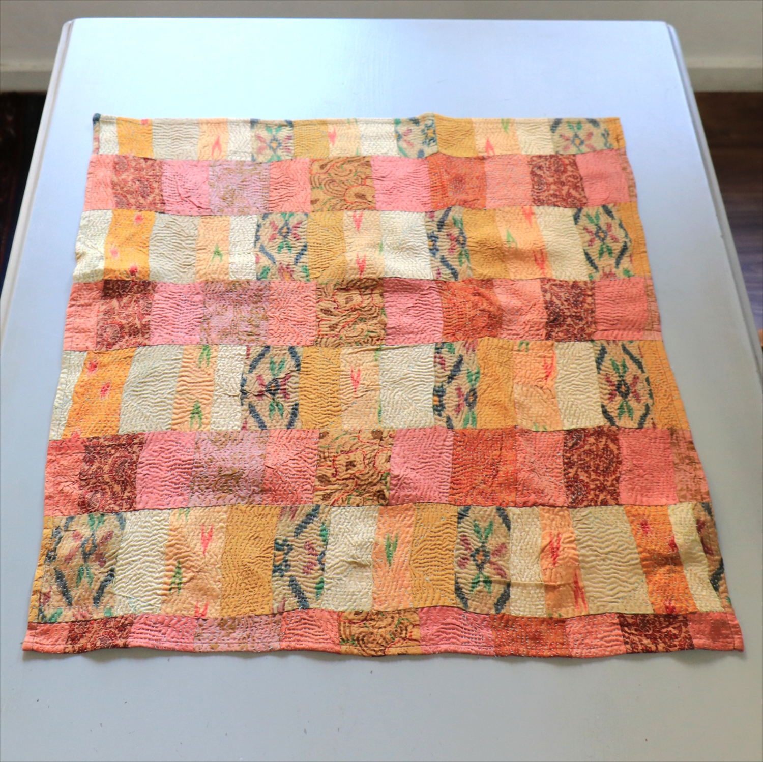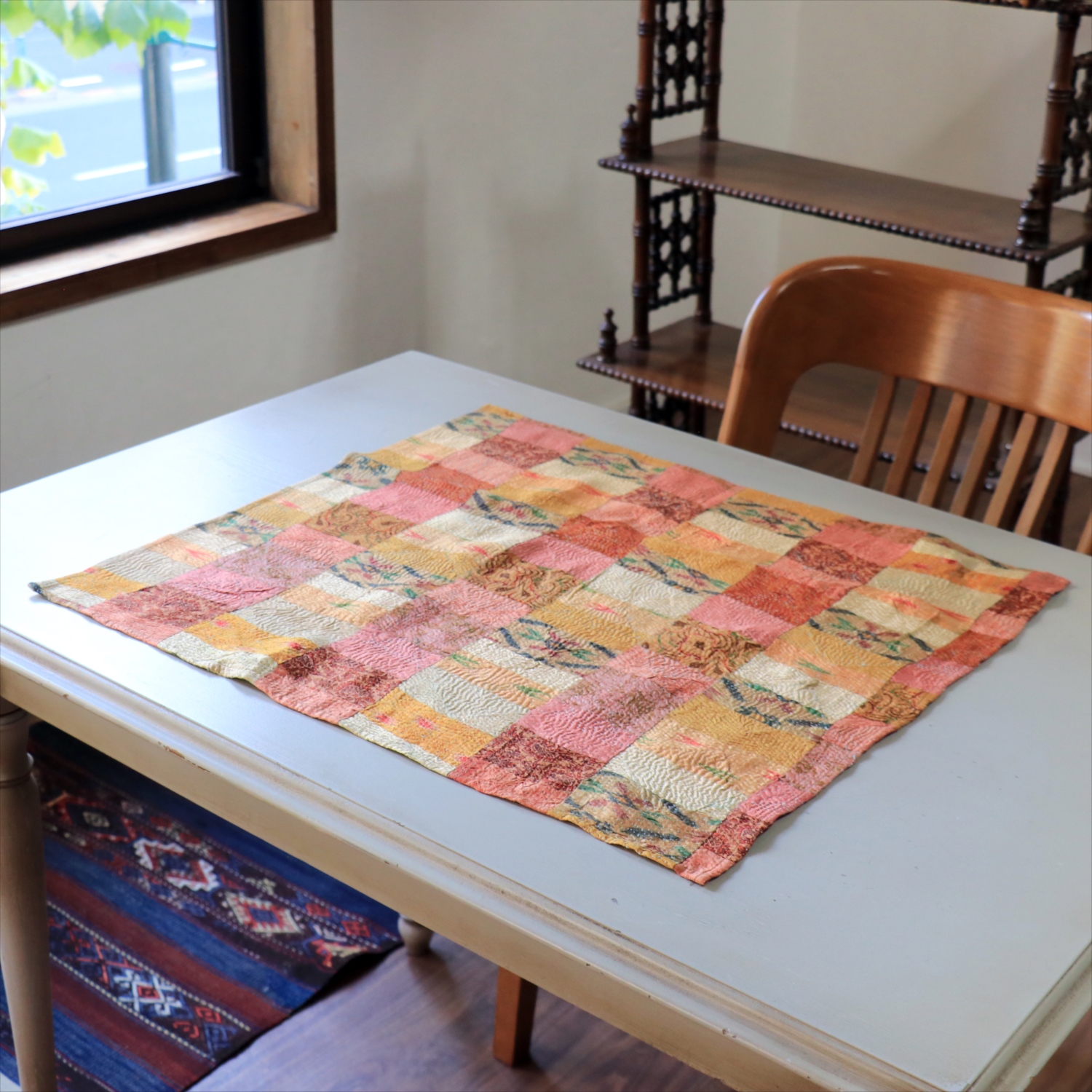 カンタ刺繍 シルク ミニクロス60×54cm<br>パッチワーク ローズ&ピーチ 両面リバーシブル