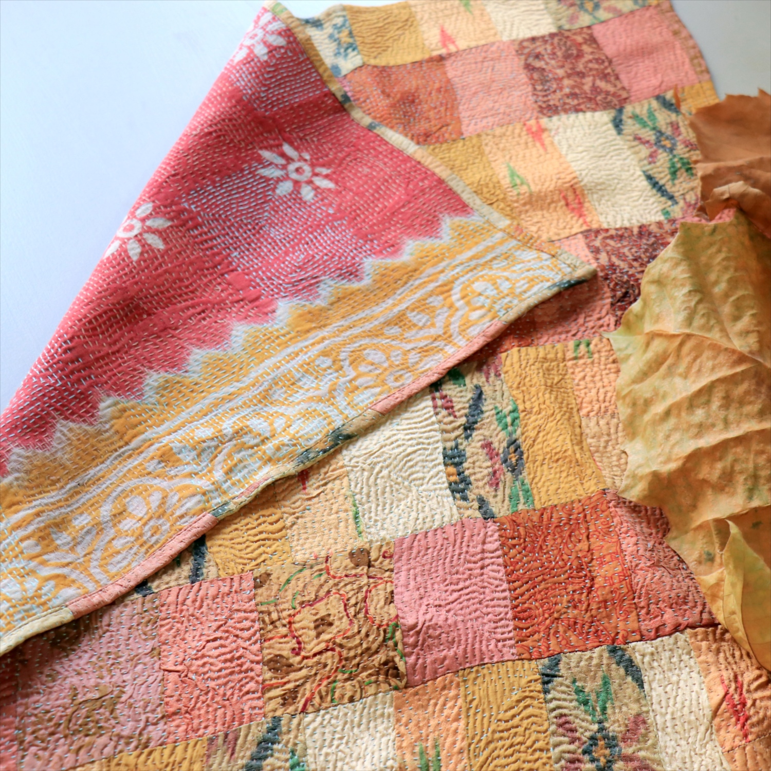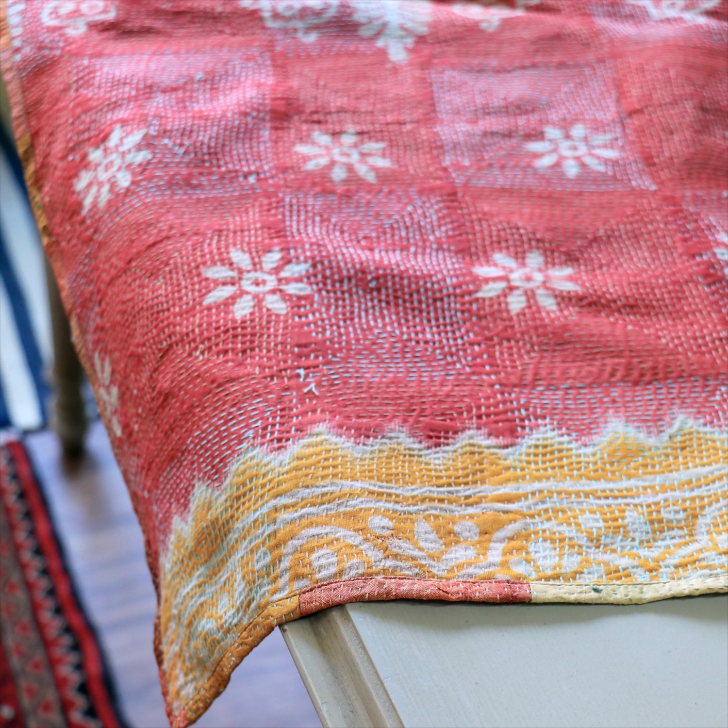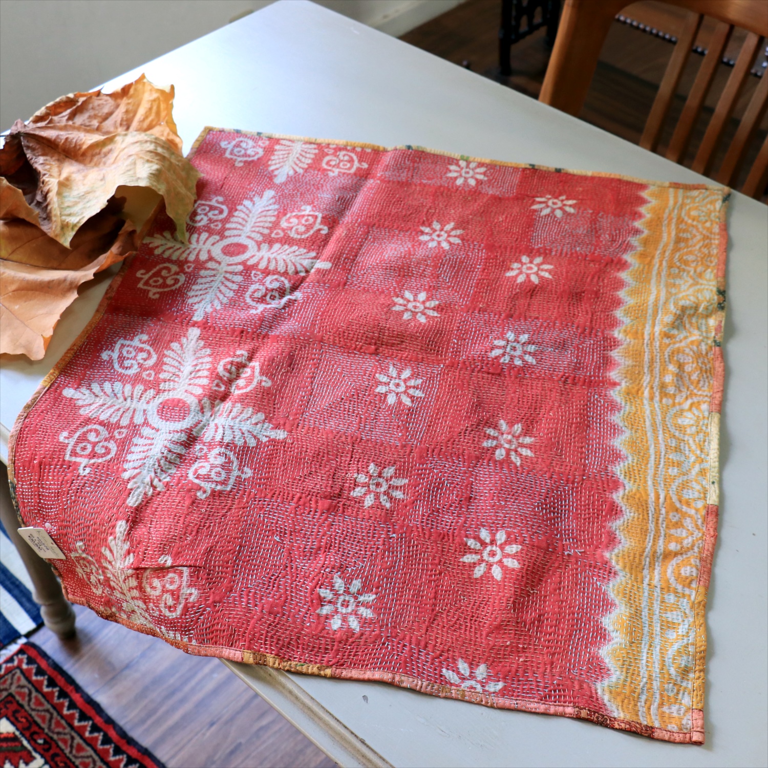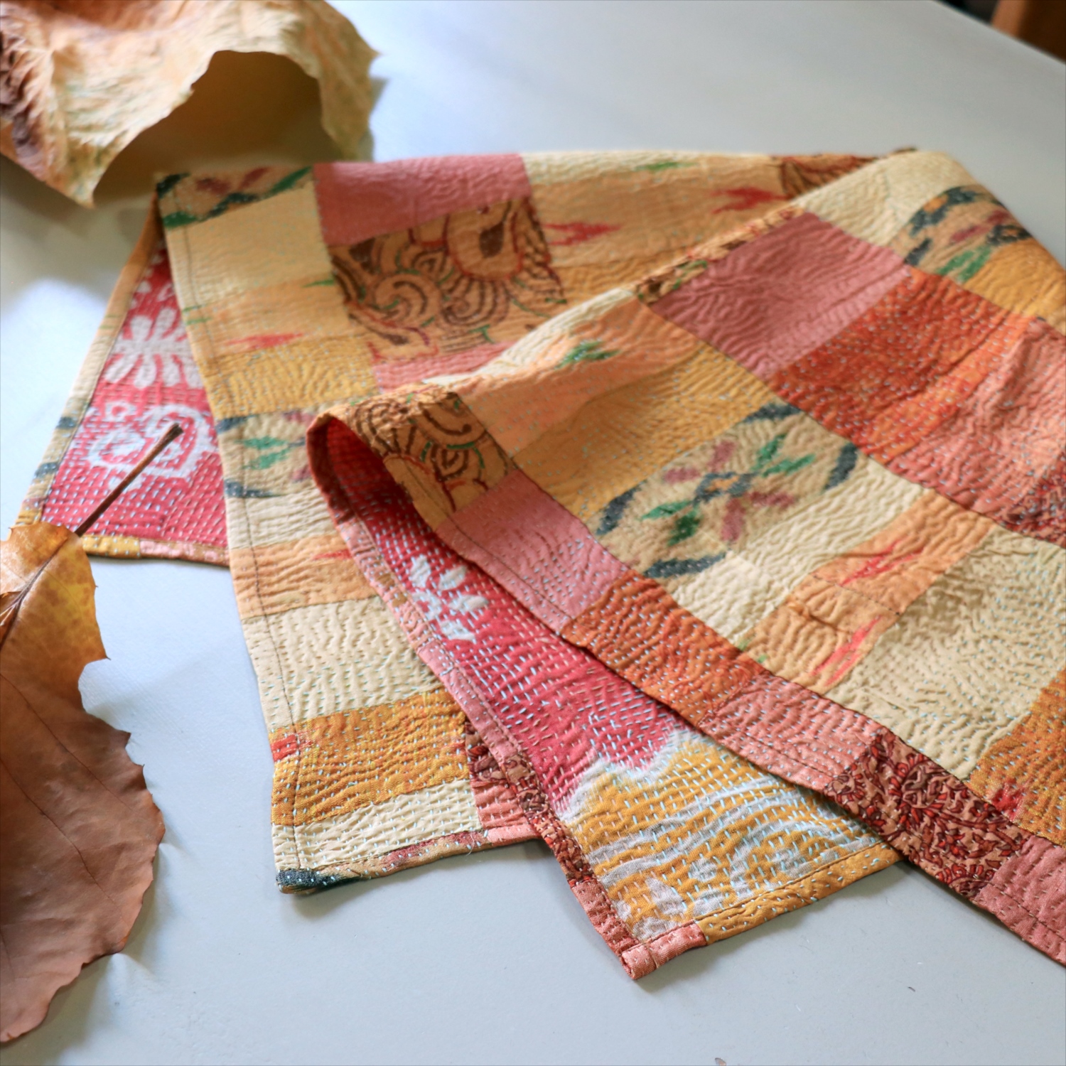 インド東部からバングラディシュにわたるベンガル地方で、古くから伝統的に作られてきた刺繍布。伝統的なものは、刺繍をするベースに古布が用いられ、ランニングステッチ(日本の刺し子に近い)で、シンプルなラインや時には小さなモチーフが表現されています。作られた布は、掛け布団(キルト加工がされる)、ショール、鏡カバー、その他生活の様々な道具として使われました。