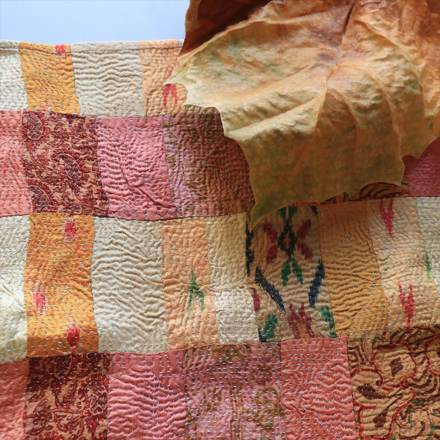 使われているサリーは20世紀後期のベンガル地方ものとされ、パッチワーク布は同じくベンガル地方でつくられました。