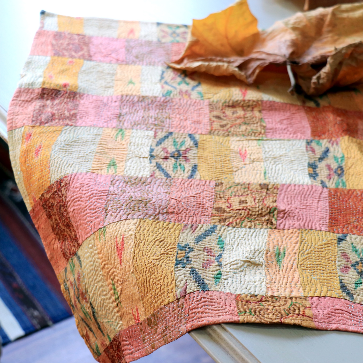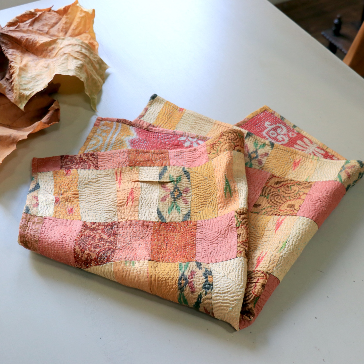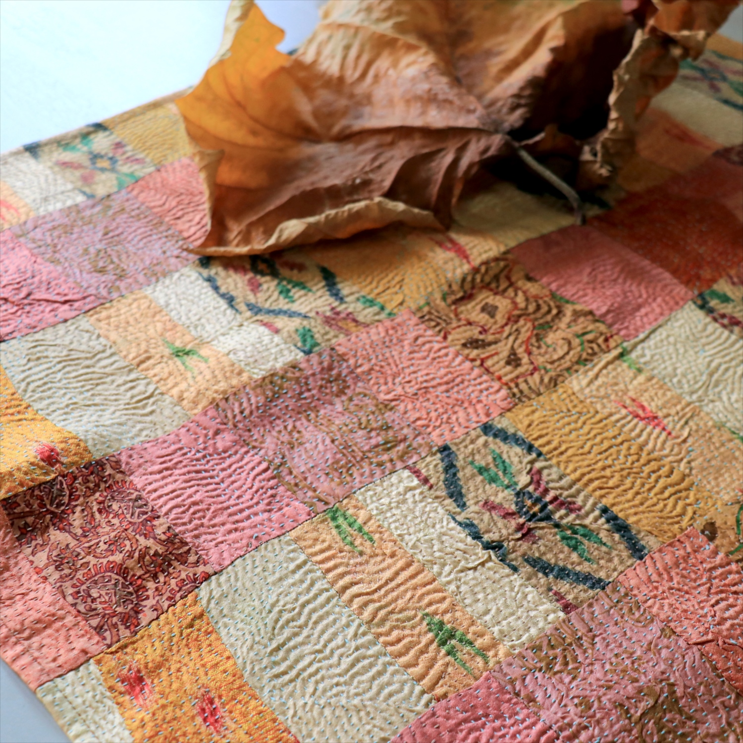 - カンタ刺繍 シルク ミニクロス60×54cm<br>パッチワーク ローズ&ピーチ 両面リバーシブル