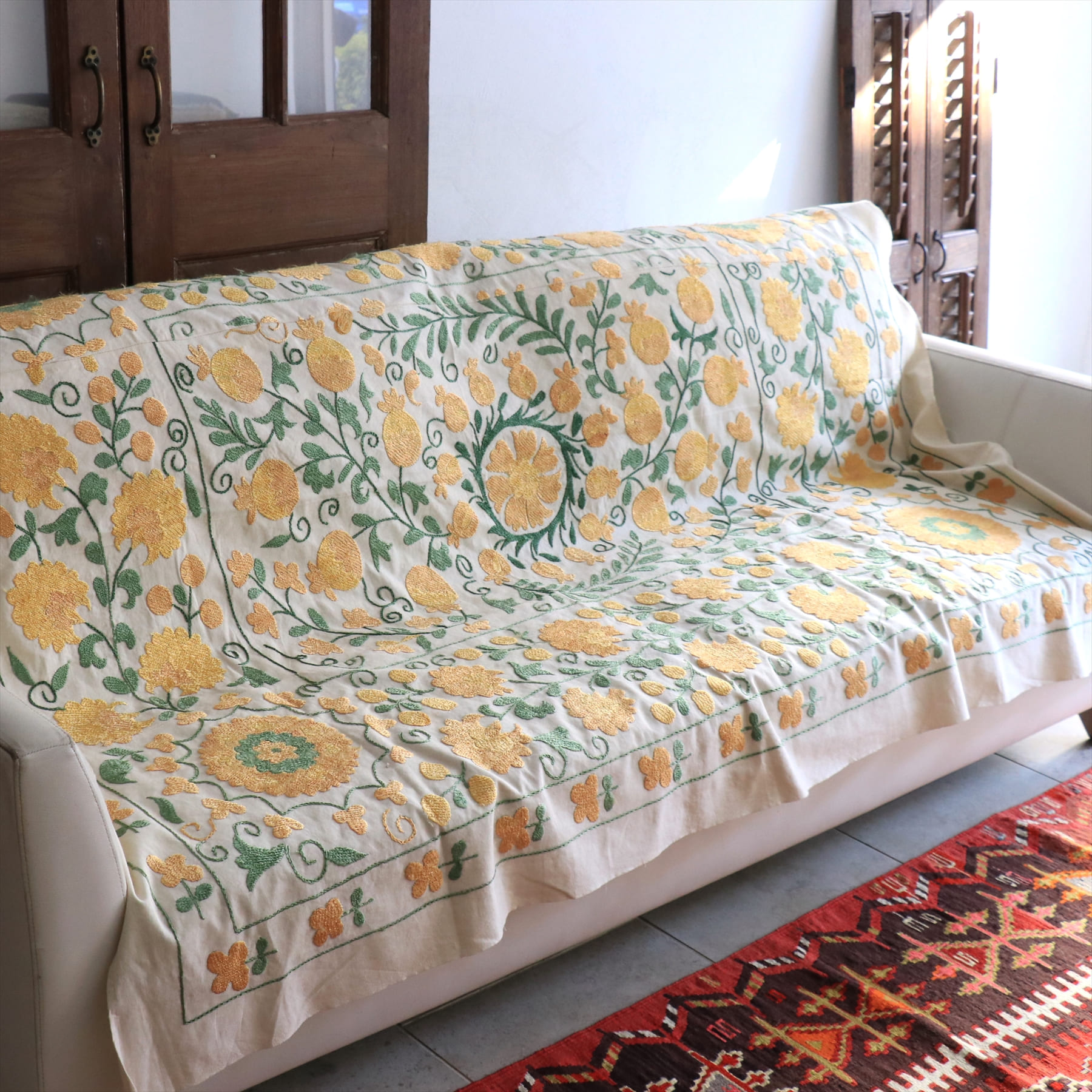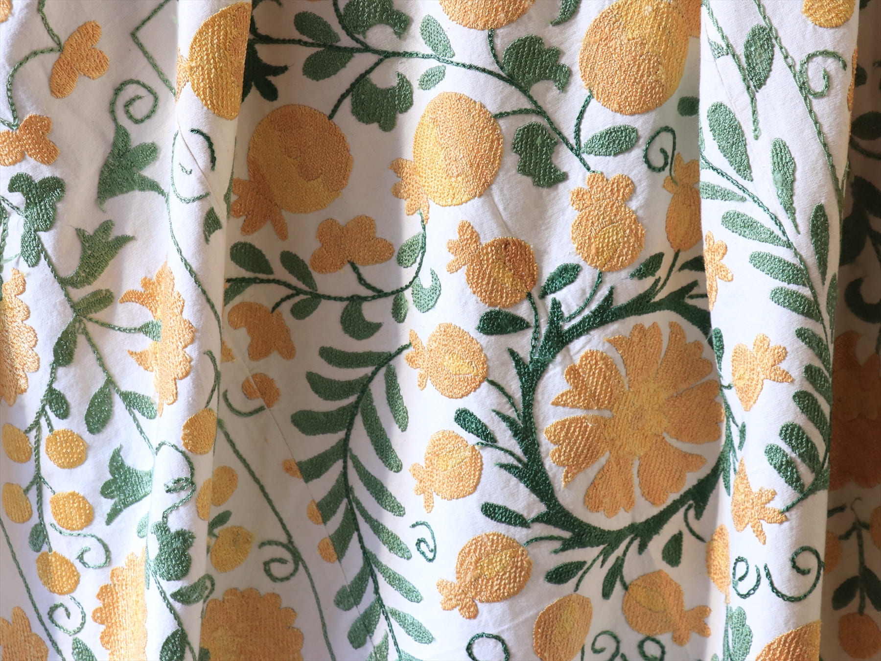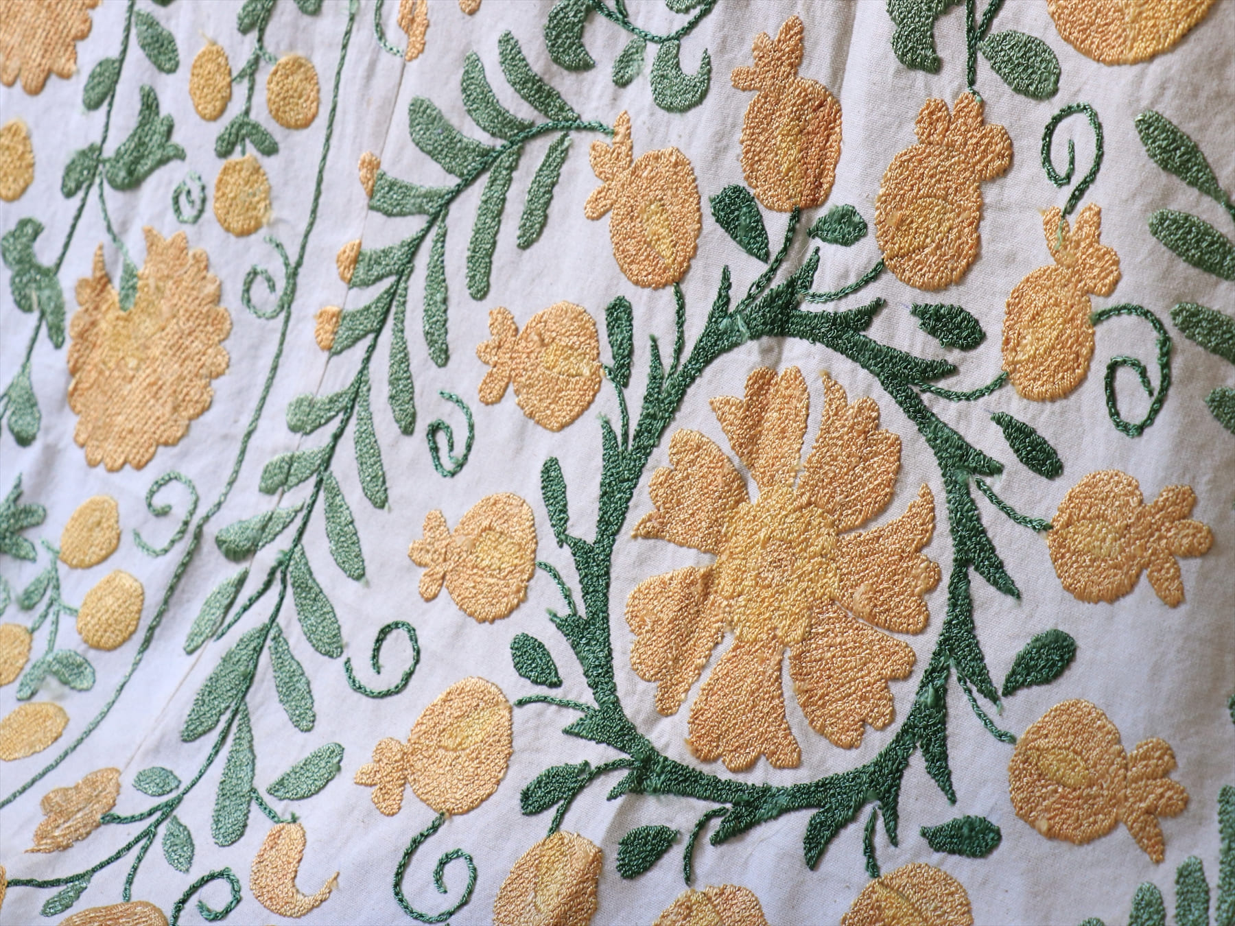 スザンニ刺繍布 ウズベキスタン190×142cm 大輪の花 イエロー アンティークデザイン