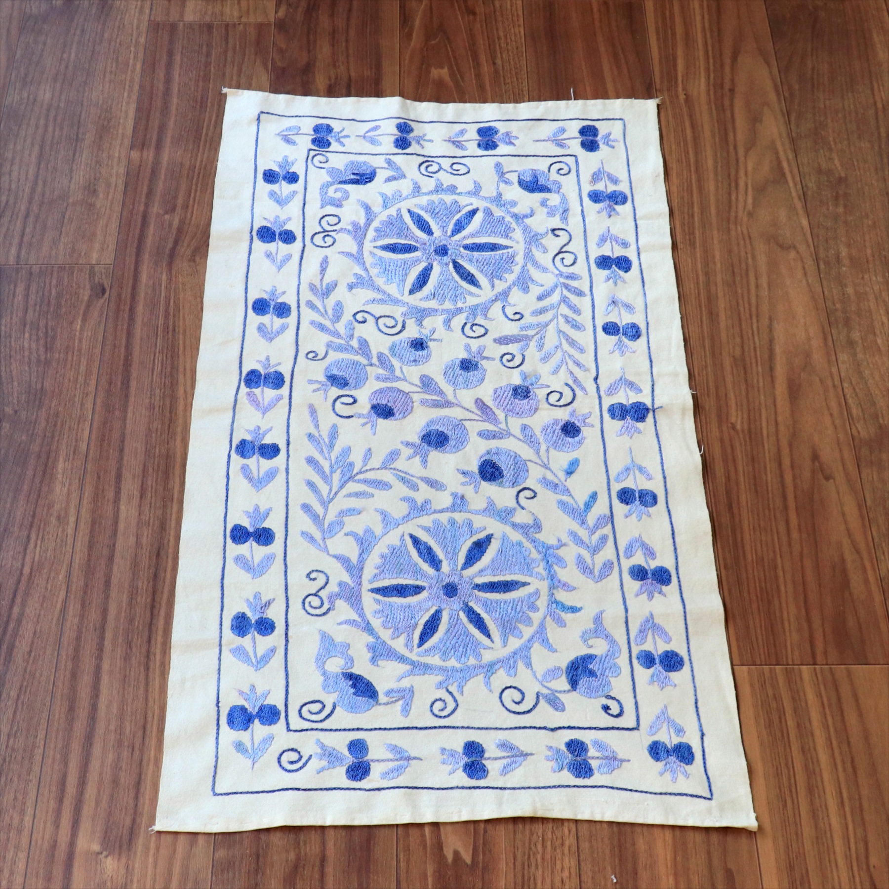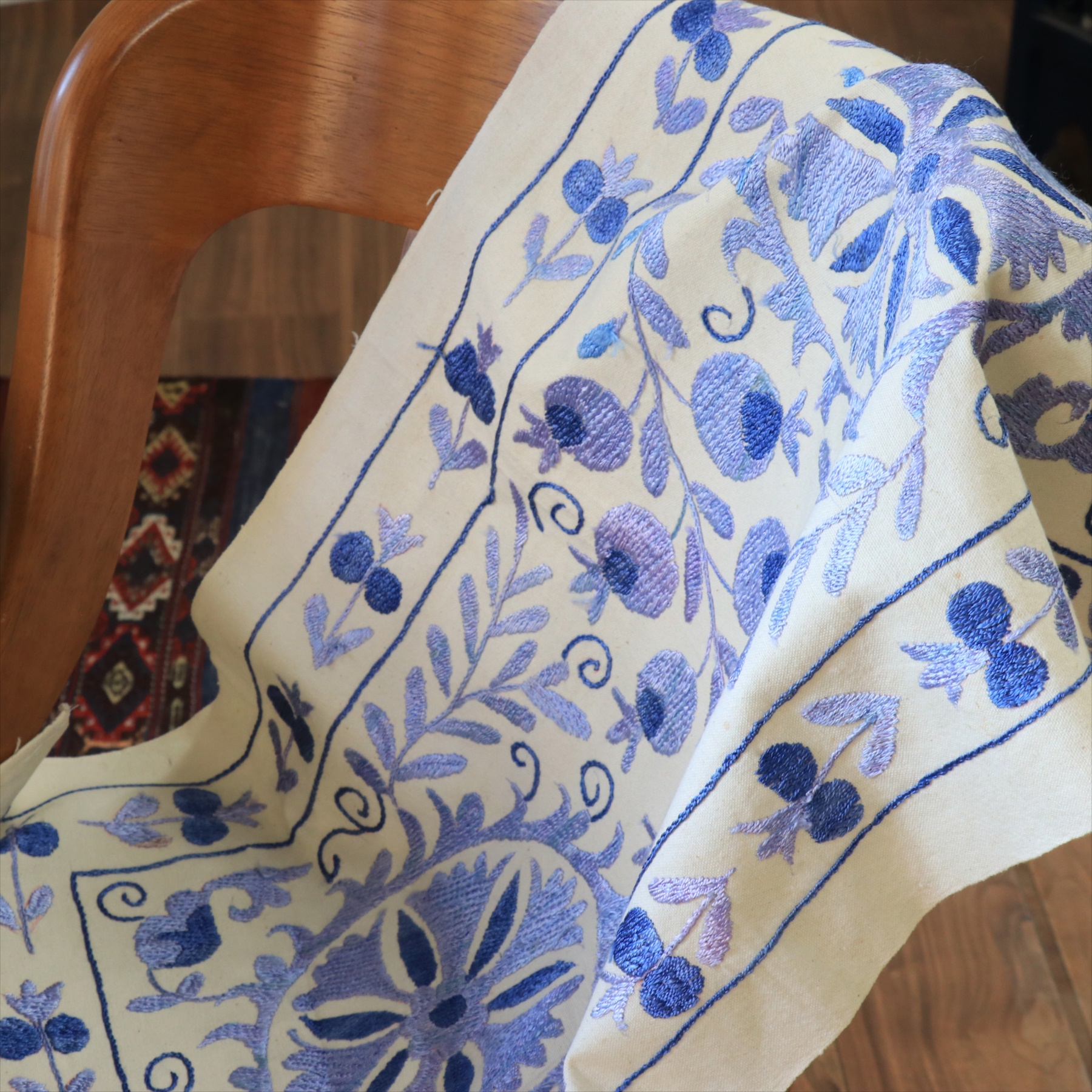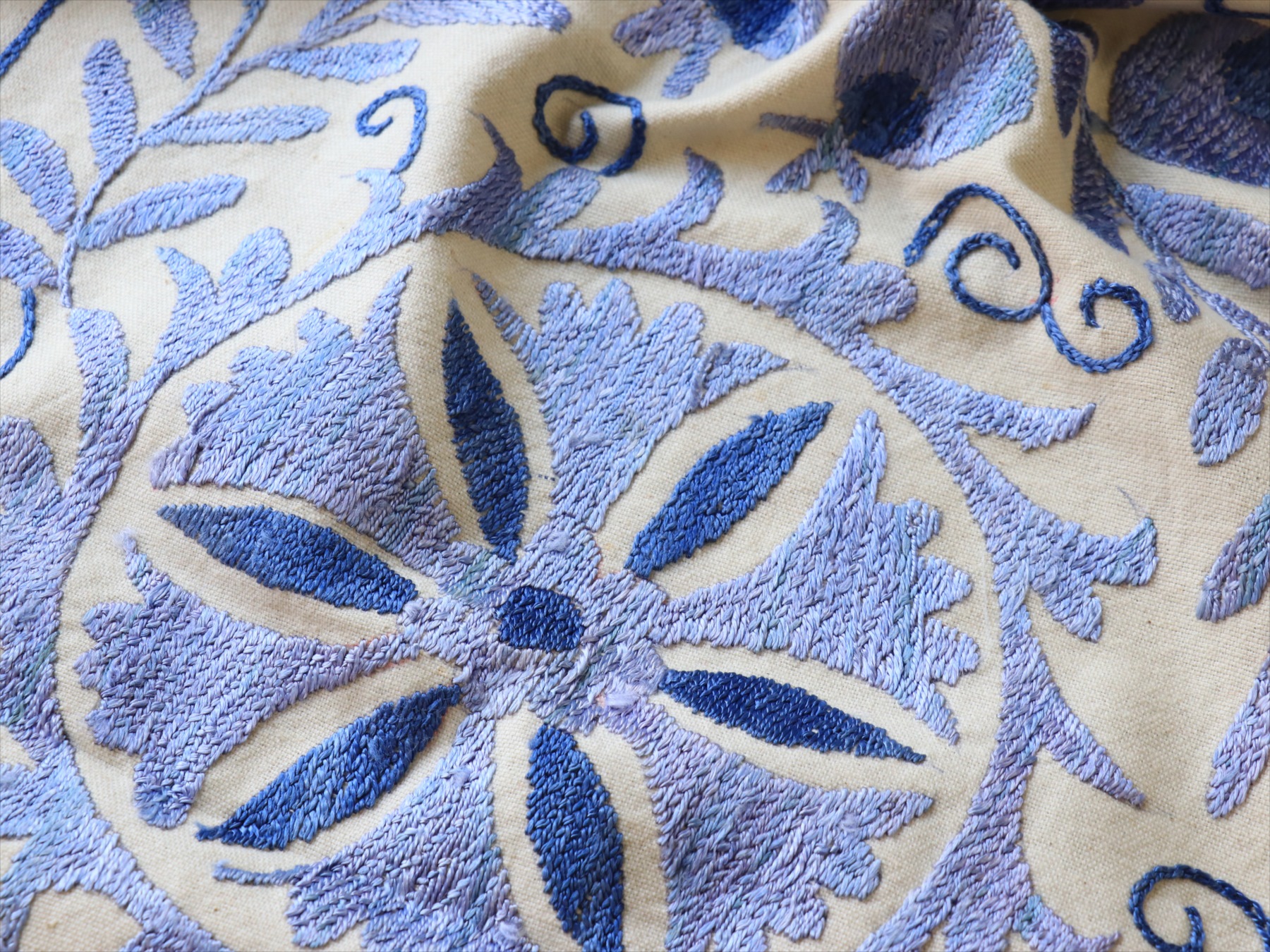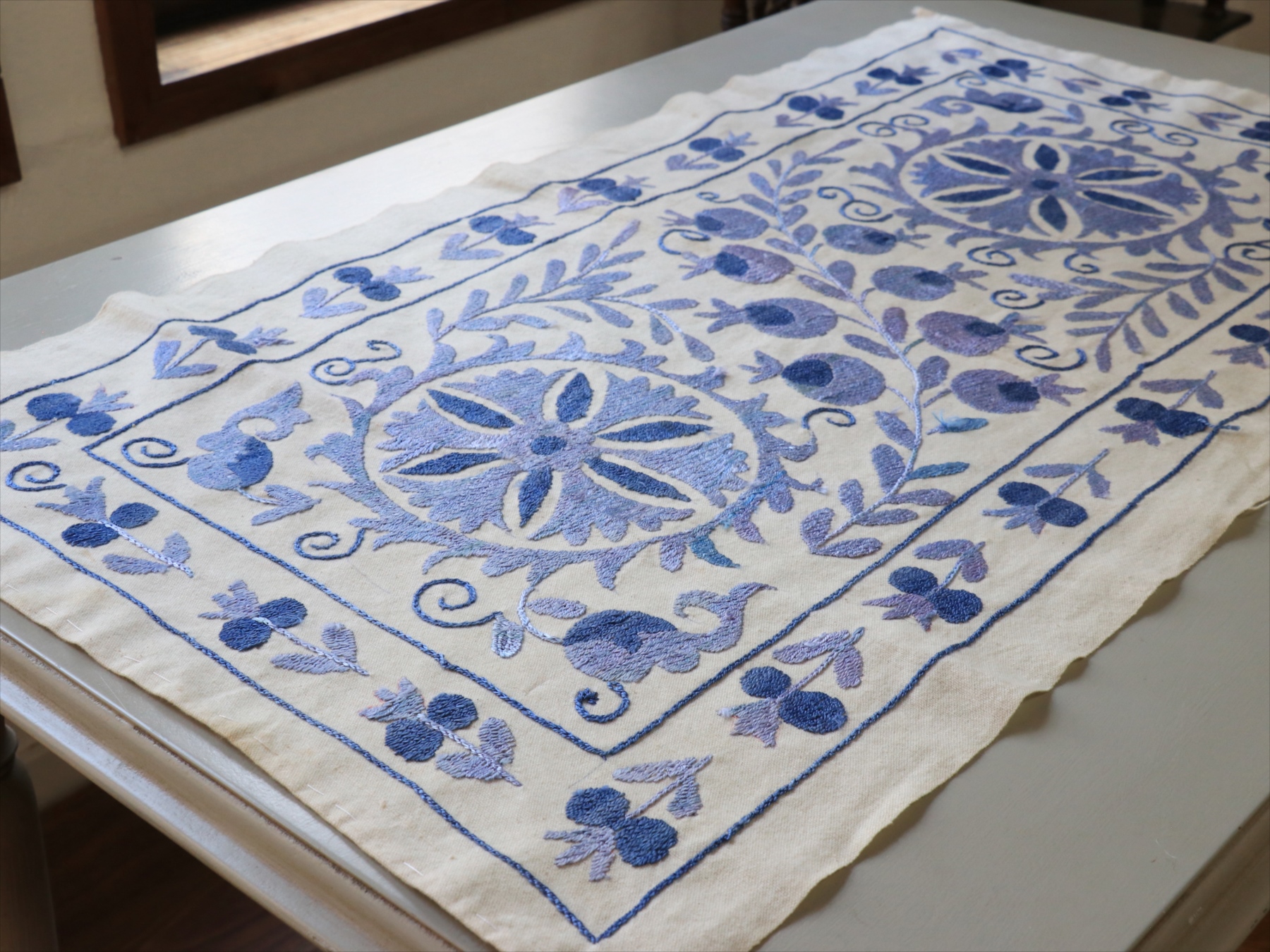 スザンニ刺繍布 ウズベキスタン86×50cm 大輪の花 ブルー テーブルセンター