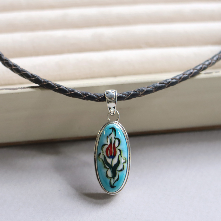 トルコキュターヤは陶芸の街!トルコの職人が、一つひとつ手描きで絵付けしたキュターヤ陶器とシルバー細工のペンダントです。シンプルなデザインで、トルコの国花チューリップが描かれています。