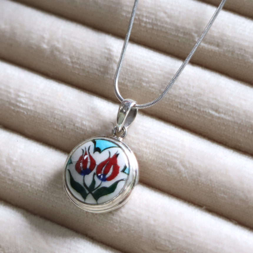 トルコキュターヤは陶芸の街!トルコの職人が、一つひとつ手描きで絵付けしたキュターヤ陶器とシルバー細工のペンダントです。トルコの国花チューリップが描かれています。