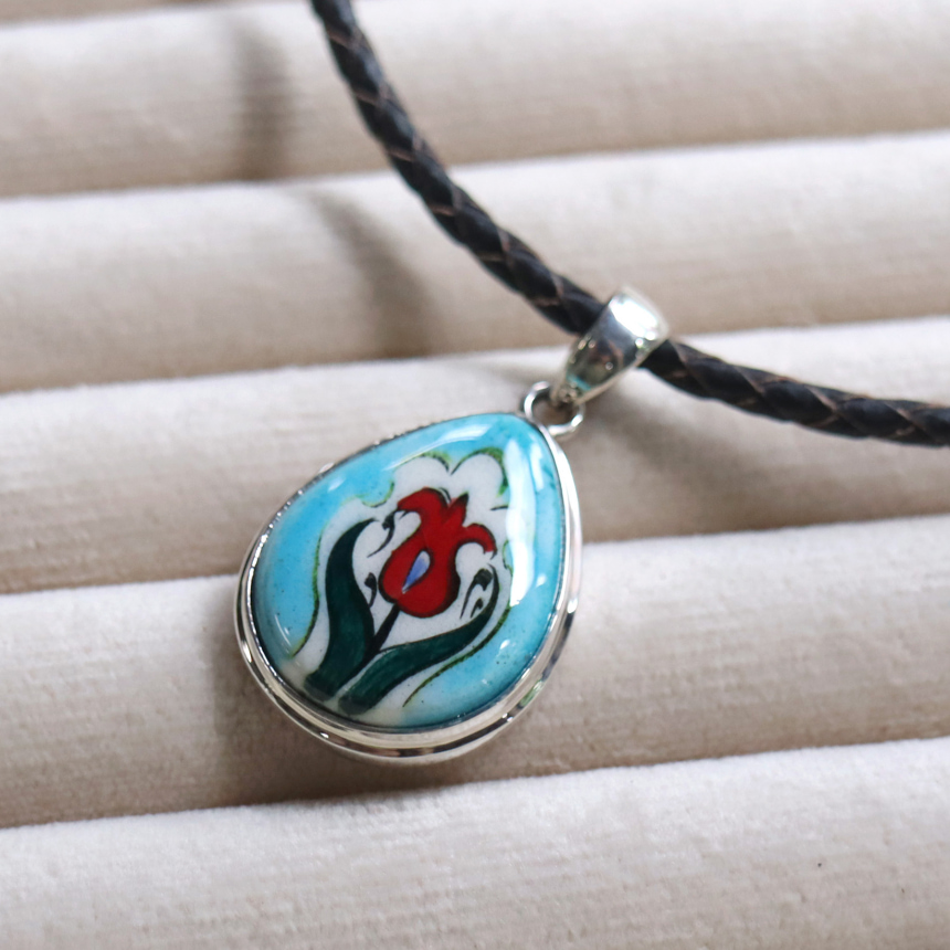 トルコキュターヤは陶芸の街!トルコの職人が、一つひとつ手描きで絵付けしたキュターヤ陶器とシルバー細工のペンダントです。シンプルなデザインで、トルコの国花チューリップが描かれています。