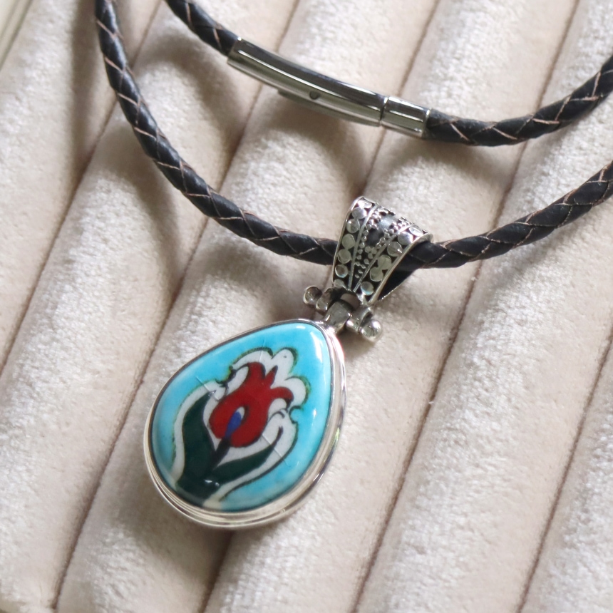 トルコキュターヤは陶芸の街!トルコの職人が、一つひとつ手描きで絵付けしたキュターヤ陶器とシルバー細工のペンダントです。シルバー細工も凝ったデザインで、本体とバチカン部分は蝶番になっていて稼働します。トルコの国花チューリップが描かれています。