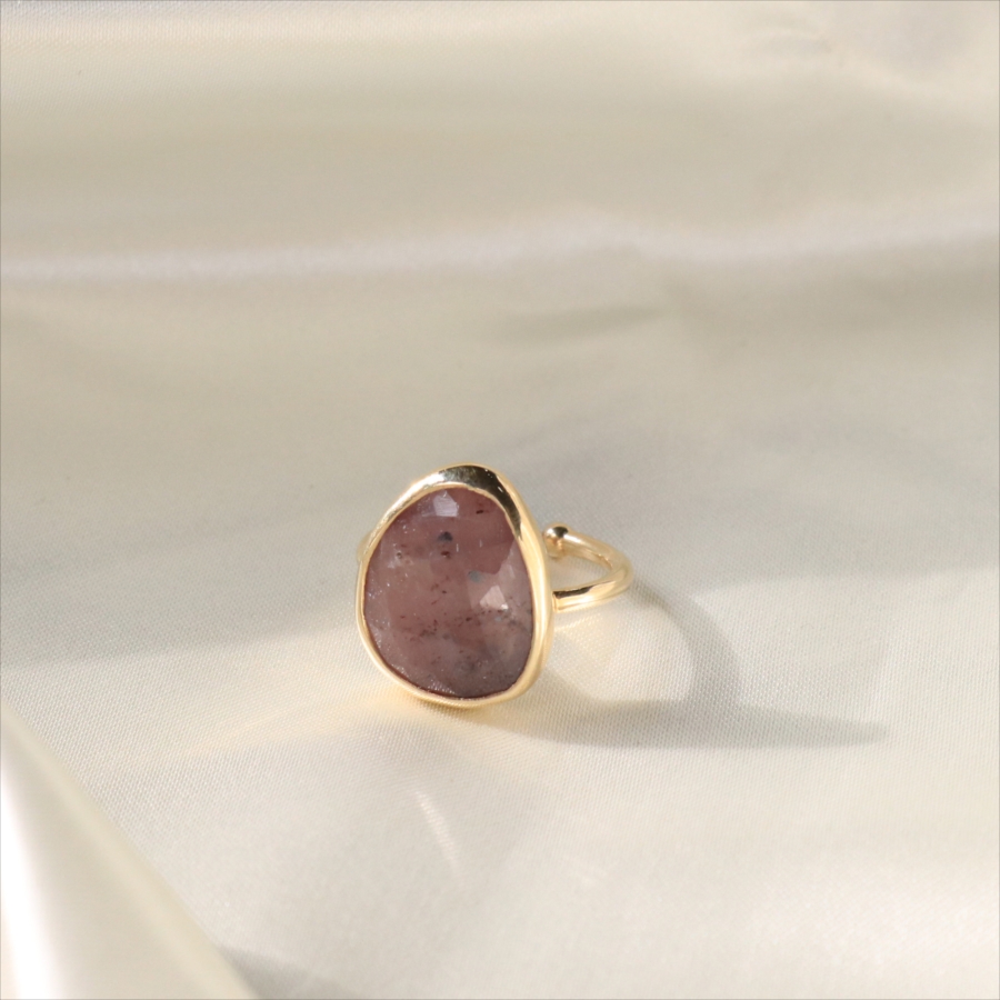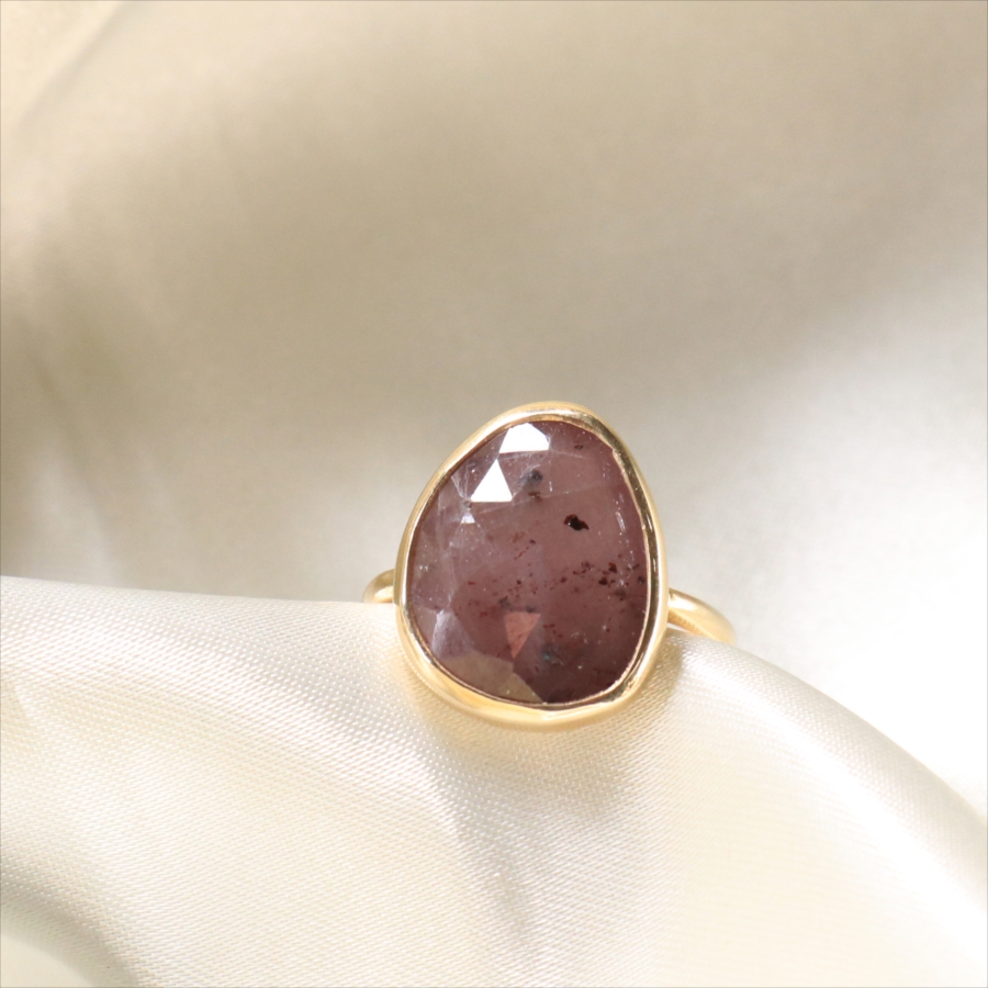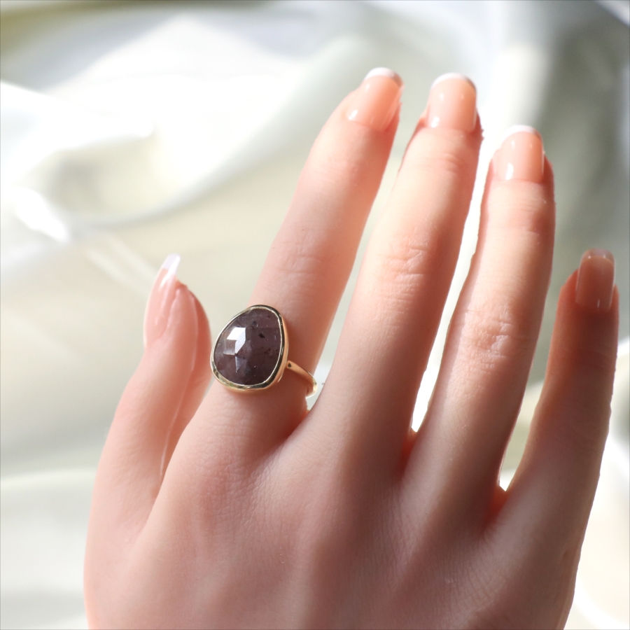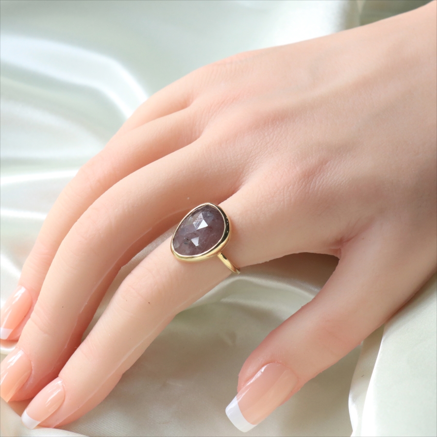 大粒の淡いグレーがかったラズベリーレッドの輝きが美しいサファイアリング。絶妙なニュアンスカラーが肌なじみ良く上品にみせてくれます。裏面は光を透す仕様になっています。