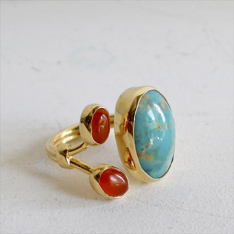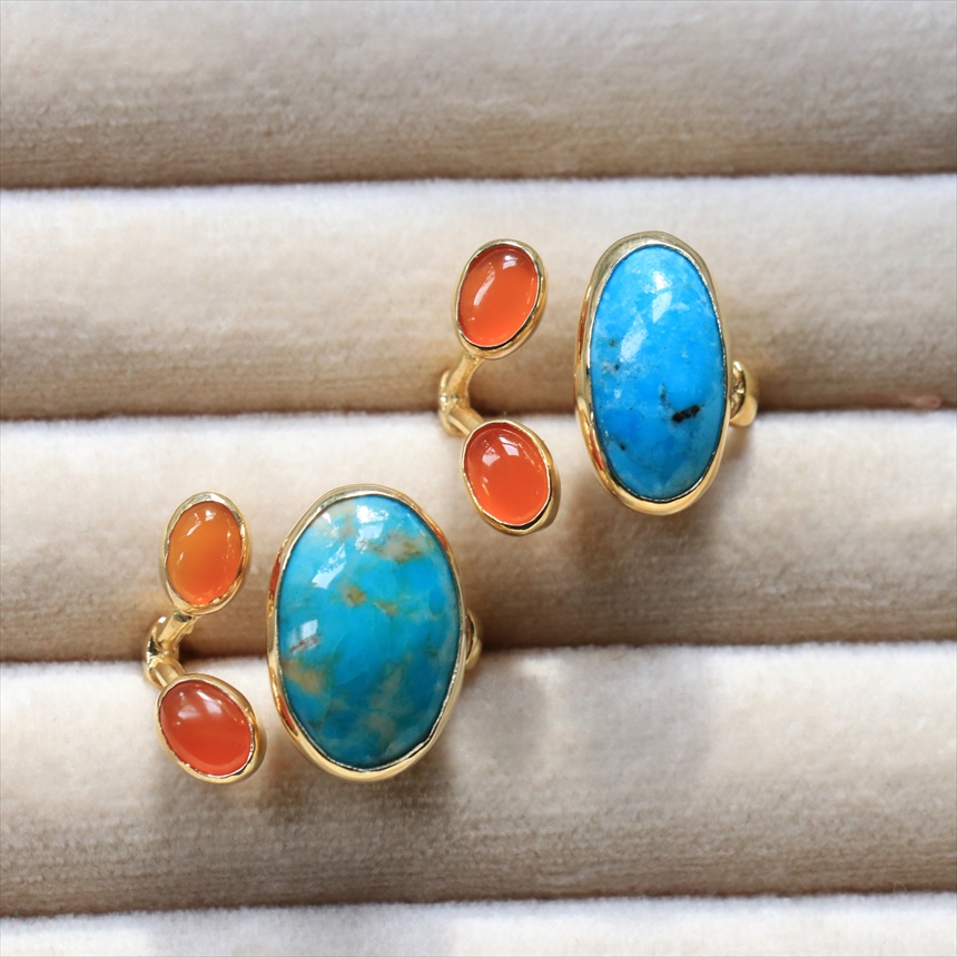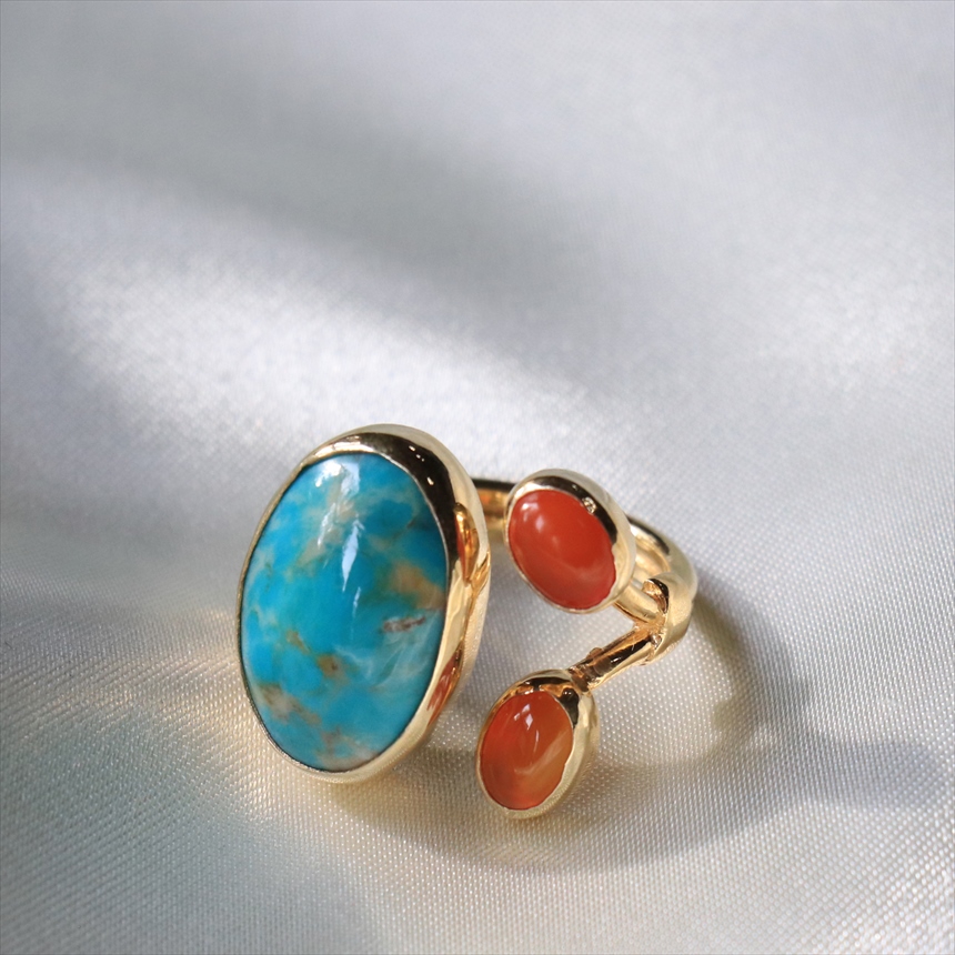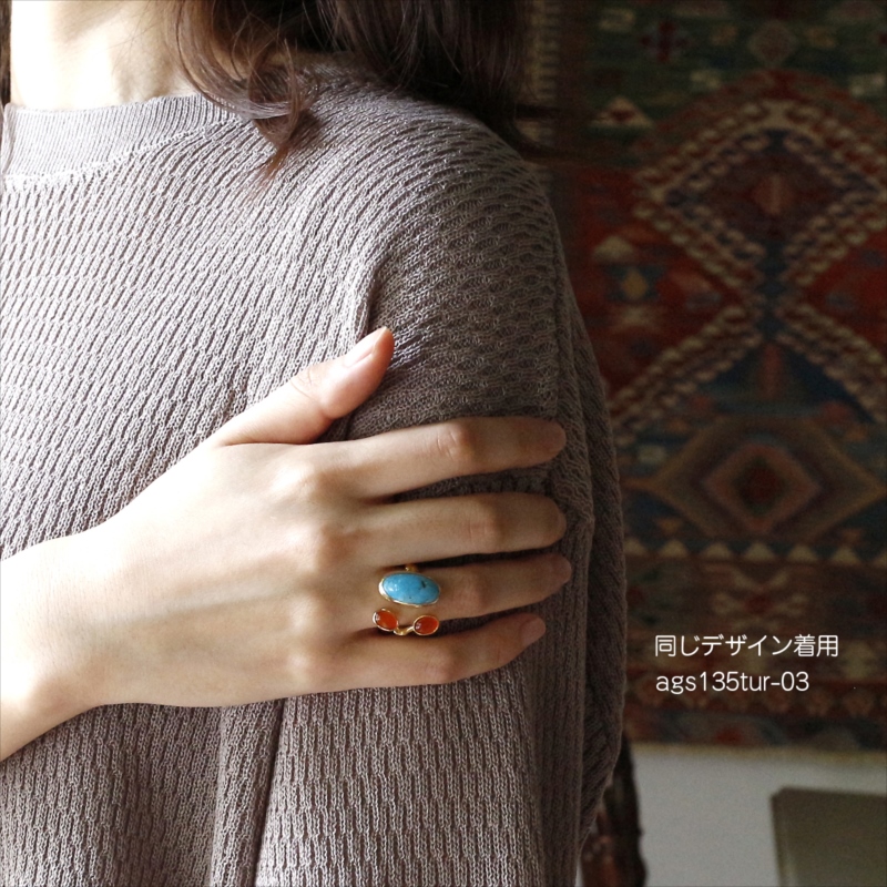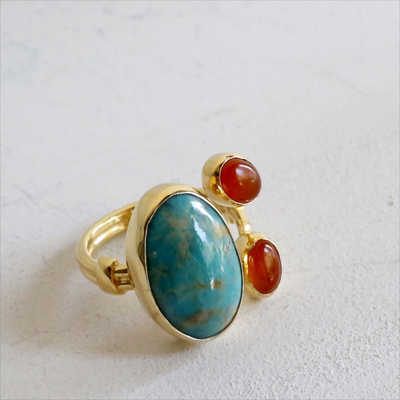 原石の雰囲気をそのままに大粒のマットなターコイズと、かわいらしいサイズのカボションカットのコロンとしたオレンジブラウンが美しいカーネリアンが二つ寄り添うようについたデザインのリングです。それぞれの石は裏面が抜けているので、光を透す仕様になっています。※ターコイズ1.7×1.2cm