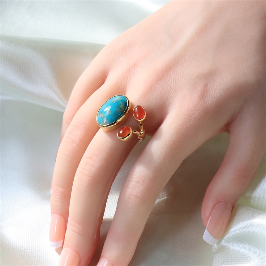 - ターコイズ×カーネリアン シルバーリング 誕生石 18KGF 天然石 三つのストーン オーバルリング トルコジュエリー