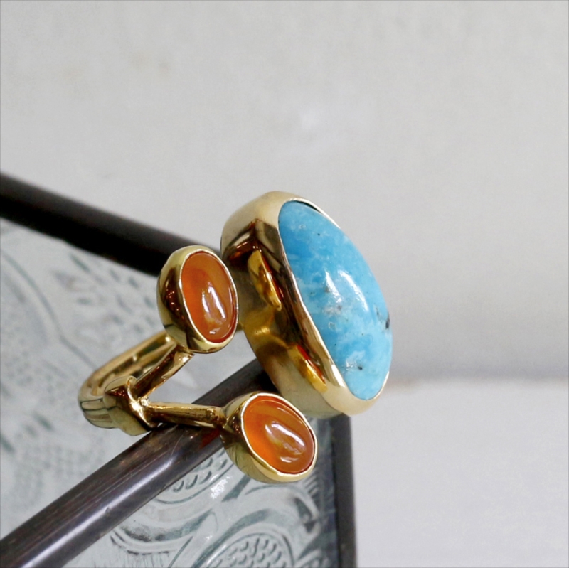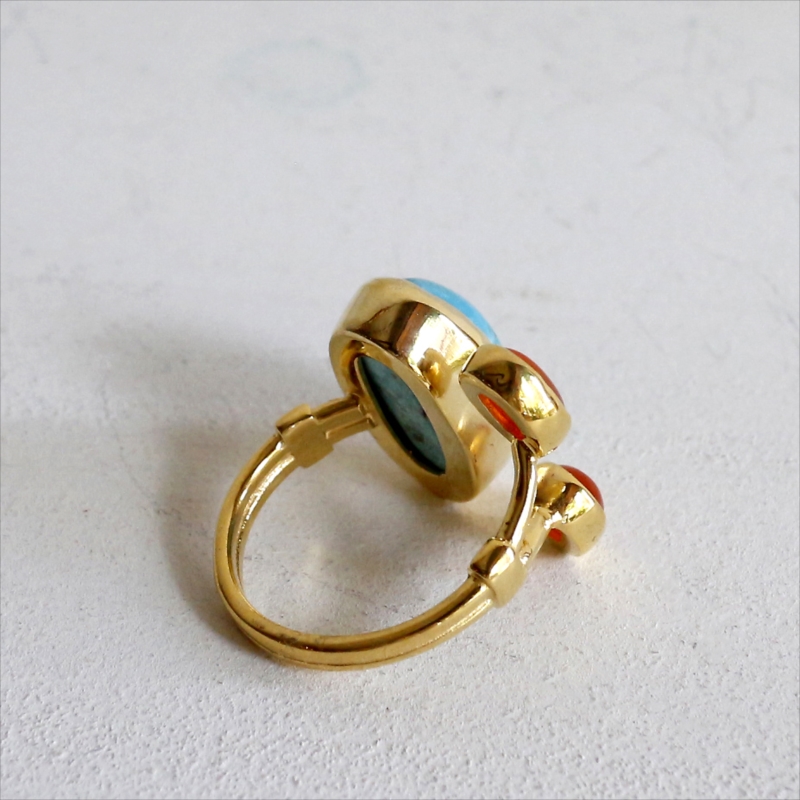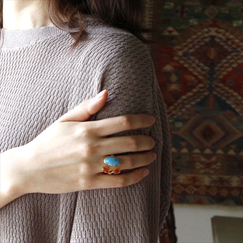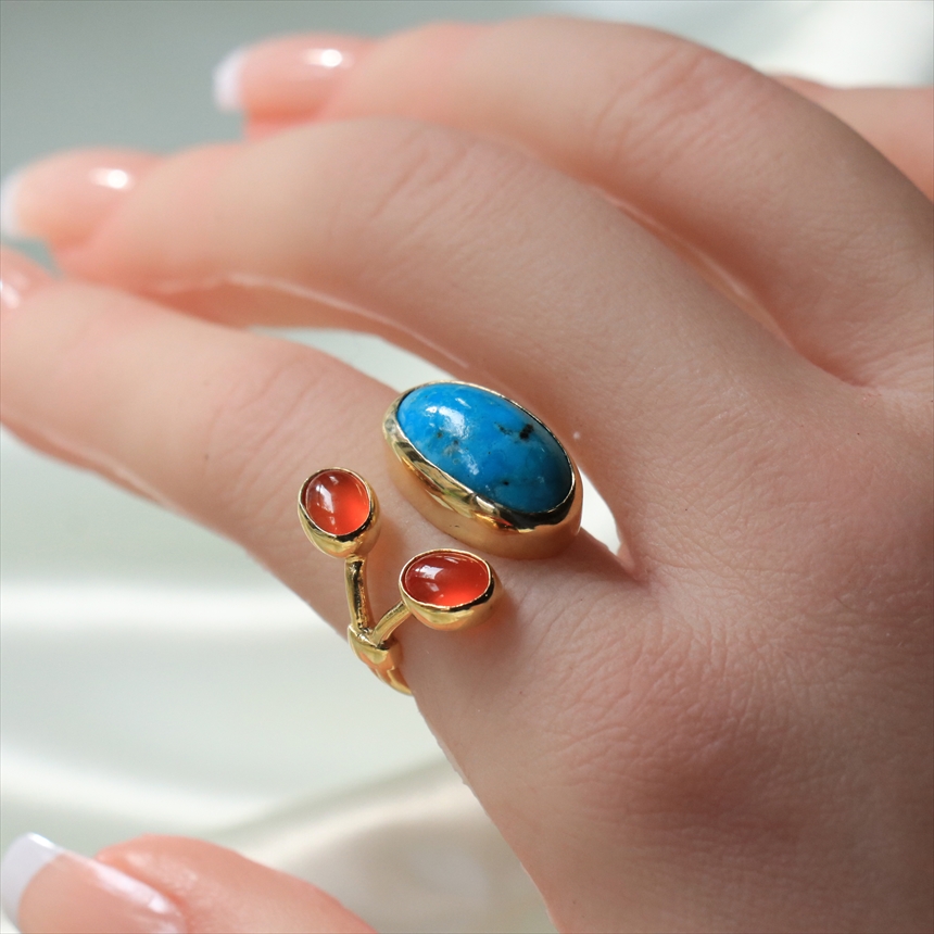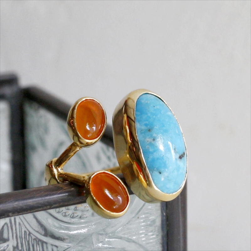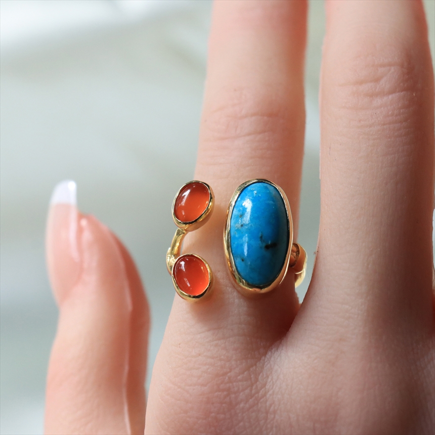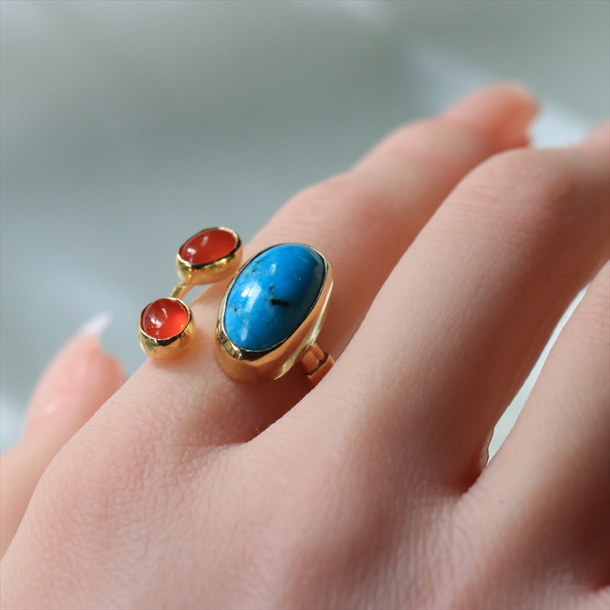原石の雰囲気をそのままに大粒のマットなターコイズと、かわいらしいサイズのカボションカットのコロンとしたオレンジブラウンが美しいカーネリアンが二つ寄り添うようについたデザインのリングです。それぞれの石は裏面が抜けているので、光を透す仕様になっています。※ターコイズ1.7×0.7cm