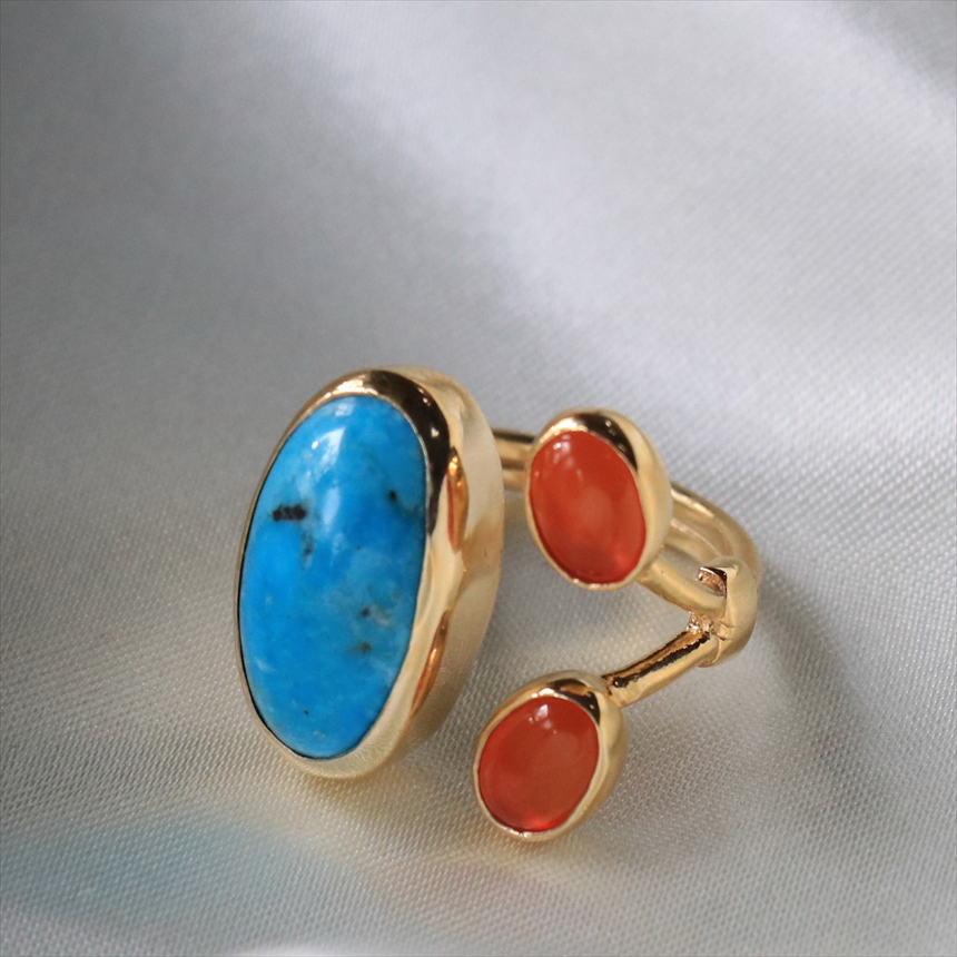 ターコイズ×カーネリアン シルバーリング 誕生石 18KGF 天然石 三つのストーン オーバルリング トルコジュエリー