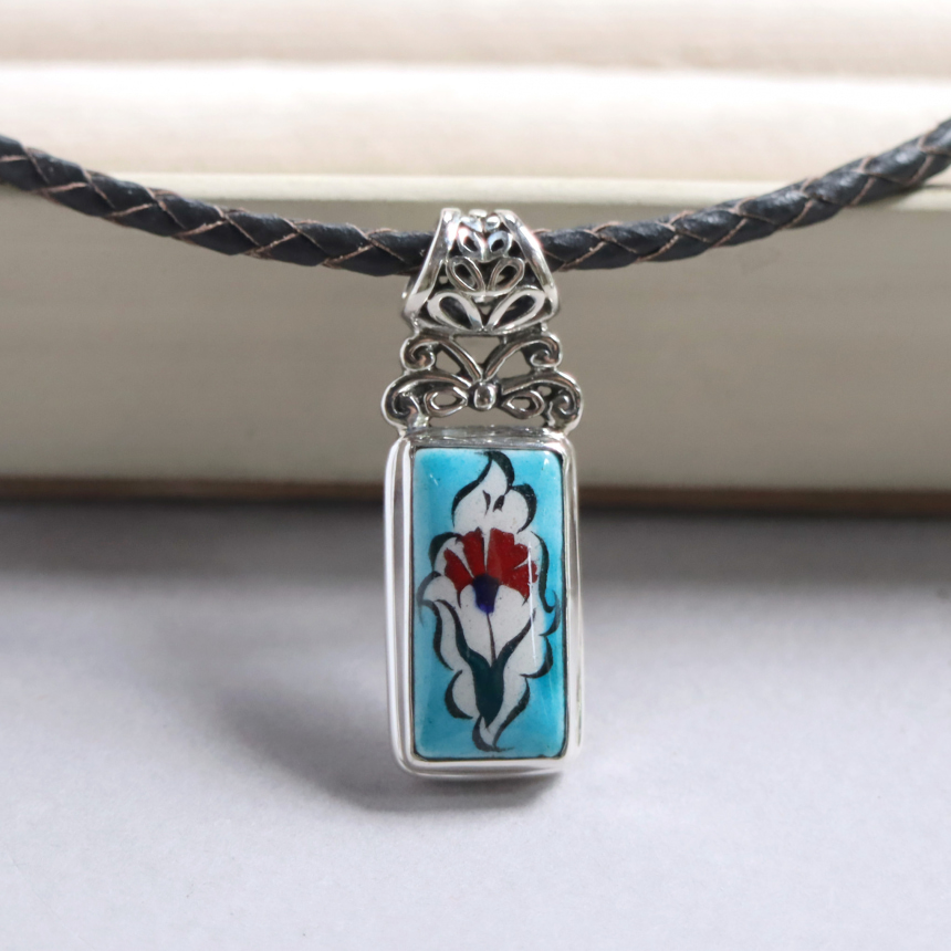 トルコキュターヤは陶芸の街!トルコの職人が、一つひとつ手描きで絵付けしたキュターヤ陶器とシルバー細工のペンダントです。バチカン部分のシルバー細工も凝ったデザインで存在感があります。赤いカーネーションが描かれています。