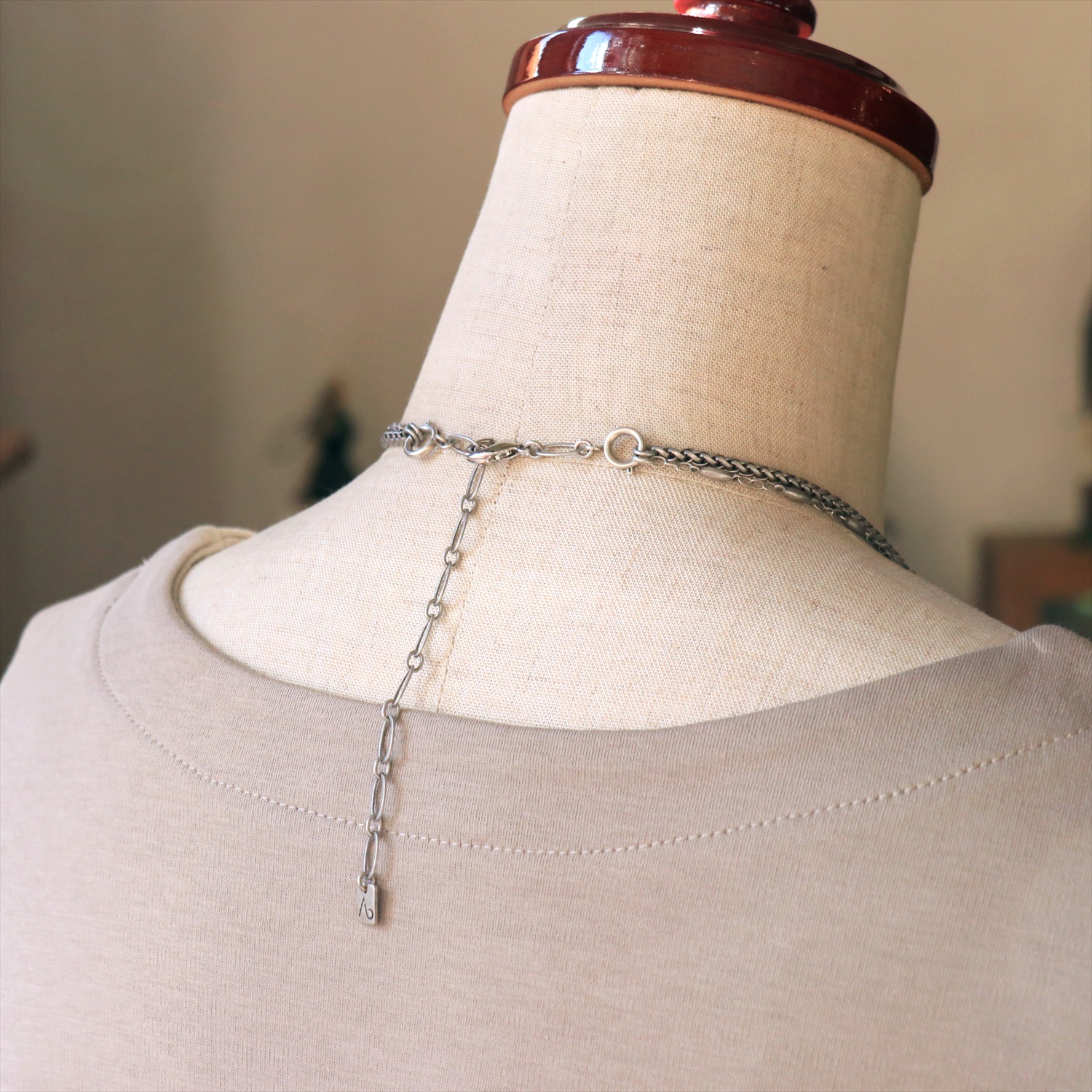 シンプルなシルバーチャームとビーズチャームがゴージャスな、2連ネックレス。蜂は西洋のラッキーチャームで、幸運を呼び込むと言われています。モチーフにはカラフルなパーツですが、遠目にみるとシルバー系の上品な雰囲気。短い連が63.5cmで、長い連が66.5cmです。トップモチーフの大きさは9.5cm×4.5cm。アジャスターを最長にすると、おヘソのあたりまで長く、スラっとした縦長のシェイプがきれいなロングネックレスです。