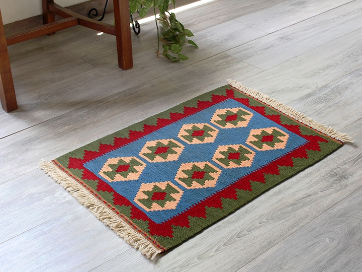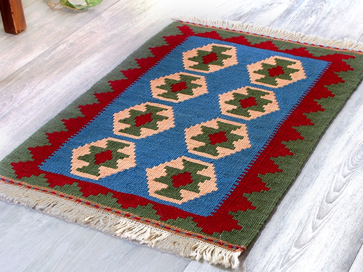 ギャッベを織ることで知られるイラン南部の遊牧民・カシュカイ族の織ったカラフルな幾何学模様がユニークな手織りキリムです。テーブルやサイドボードのうえに敷いたり、もちろん玄関マットとしても個性的なお部屋のアクセントになってくれます。