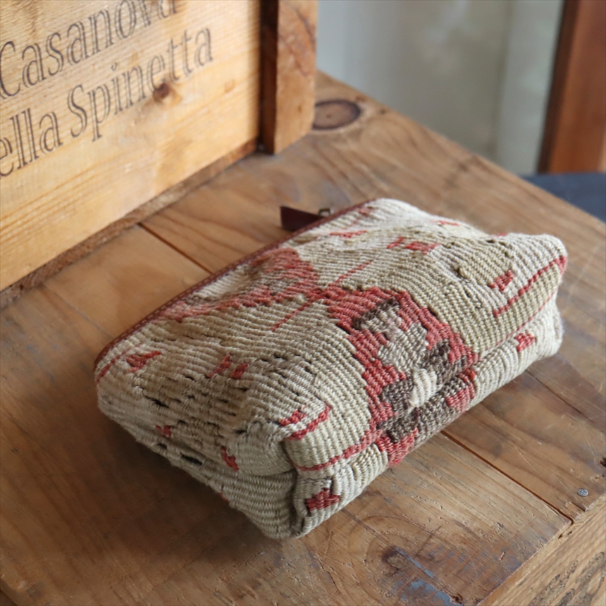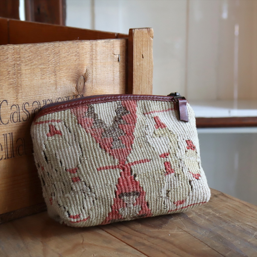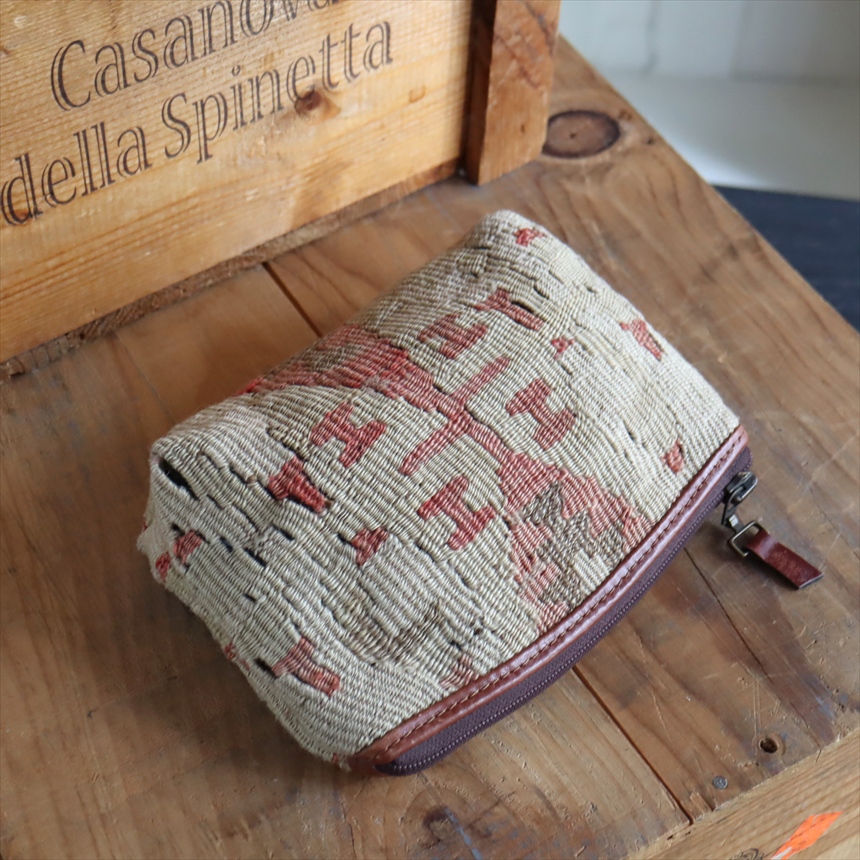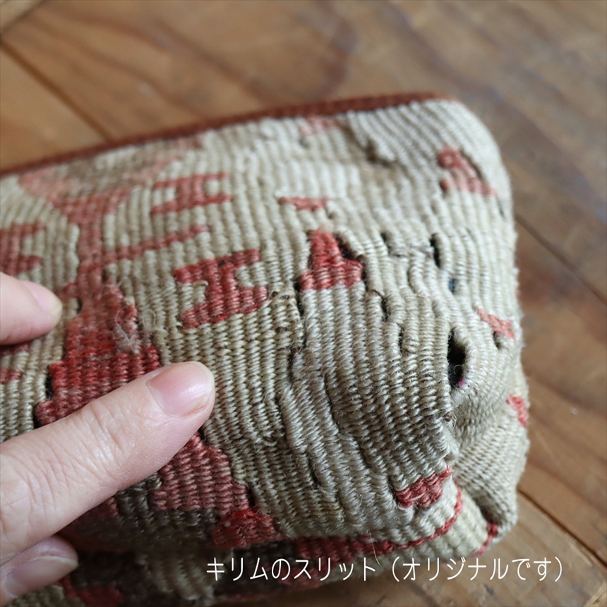 オールドキリムを使ったミニポーチです。ファスナー部分に牛革のパイピングを使っています。キリムのモチーフの色の切り替え部分にスリット(縦の隙間)が空いていますが、キリムの織りの技法ですのでそのままになっています。