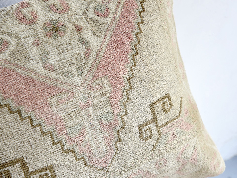 オールドカーペットのクッションは、長い間家庭で使われていたり、ダメージがあったりする手織りカーペットを使っているため、表面のパイルはすり減って結び目が見えている部分やなどがあります。クッションに加工する前には、きれいに水洗いされています。