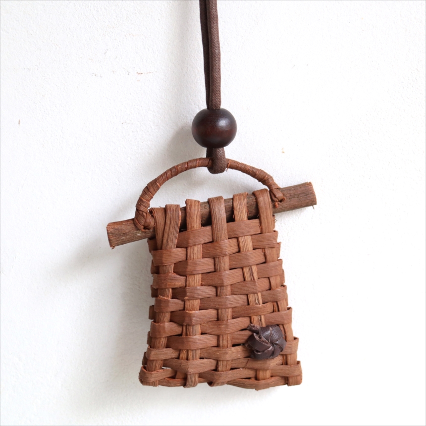 山ぶどうの蔓を編んでつくられた根付です。ユニークな形は、縦と横それぞれ一本ずつのひごを使って編まれていて、職人さんの遊び心が感じられる小さな作品です。