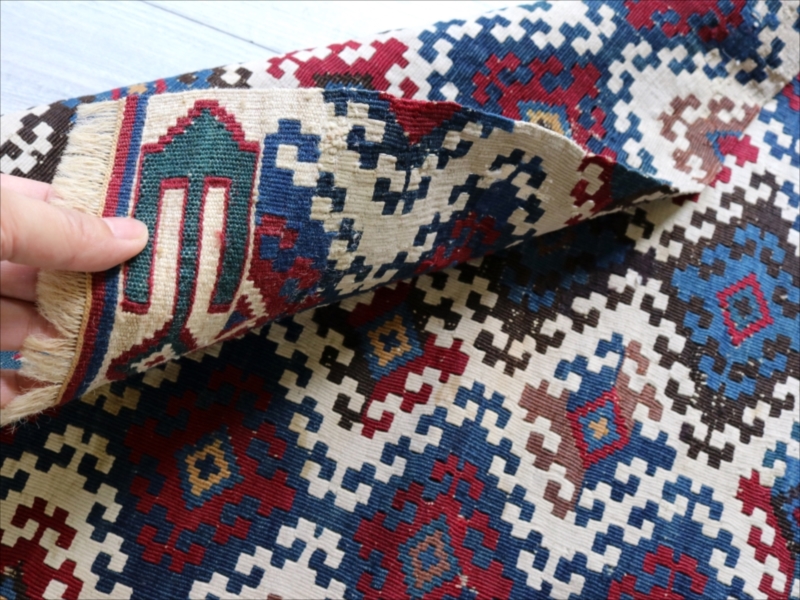 二つに折って袋として縫い合わせて使うために織られたキリムで、オリジナルはおそらく左右二対になっていたものです。厳密にはわかりませんが、ほぼ全ての色が天然染料の染めといってよいかと思います。100年を経過した現在でも、しっかりとした鮮やかな色が残っています。