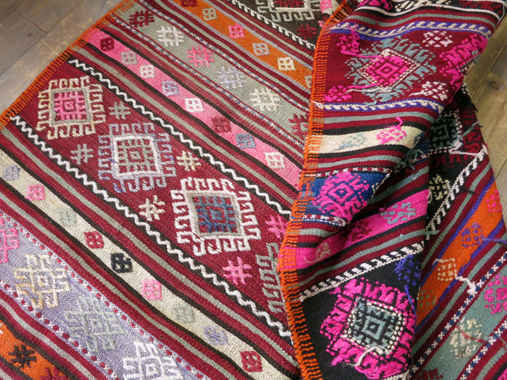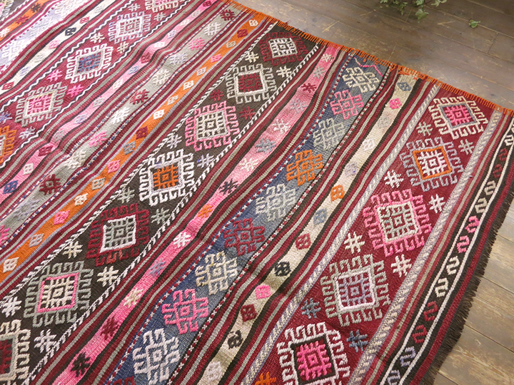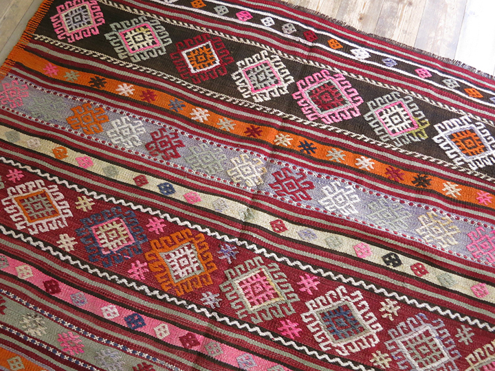 アナトリアの北西部バルケスィールエリアのキリムです。カラフルなジジムモチーフが大胆に織り込まれた華やかなキリムです。ちょうど合成の染料が使われるようになって、華やかなピンクなどが流行していた時代のもので、今となってはそのピンクもその時代の象徴ということで、合成染料ならではの明るいピンクも評価されるようになってきました。パープルのみ日焼けしてパステルカラーになっていますが、他は鮮やかな色合いを残しています。