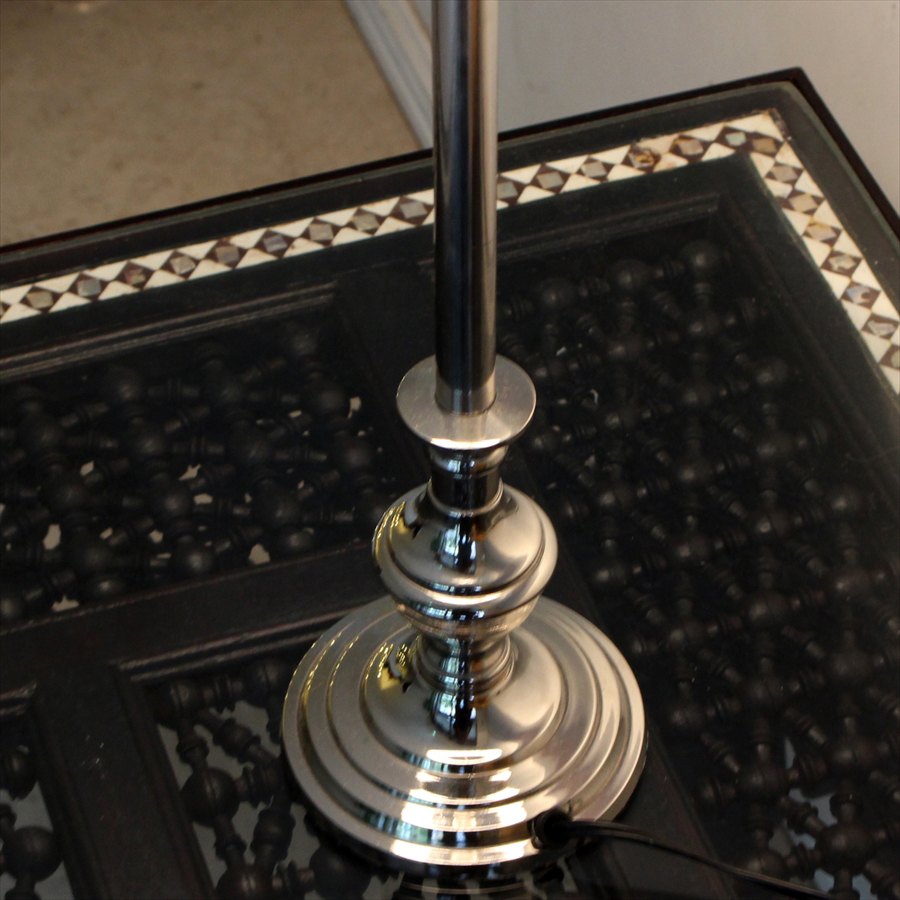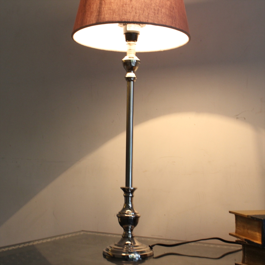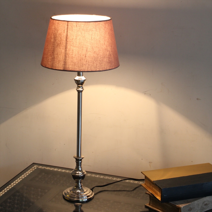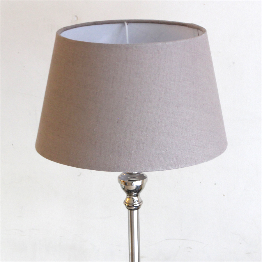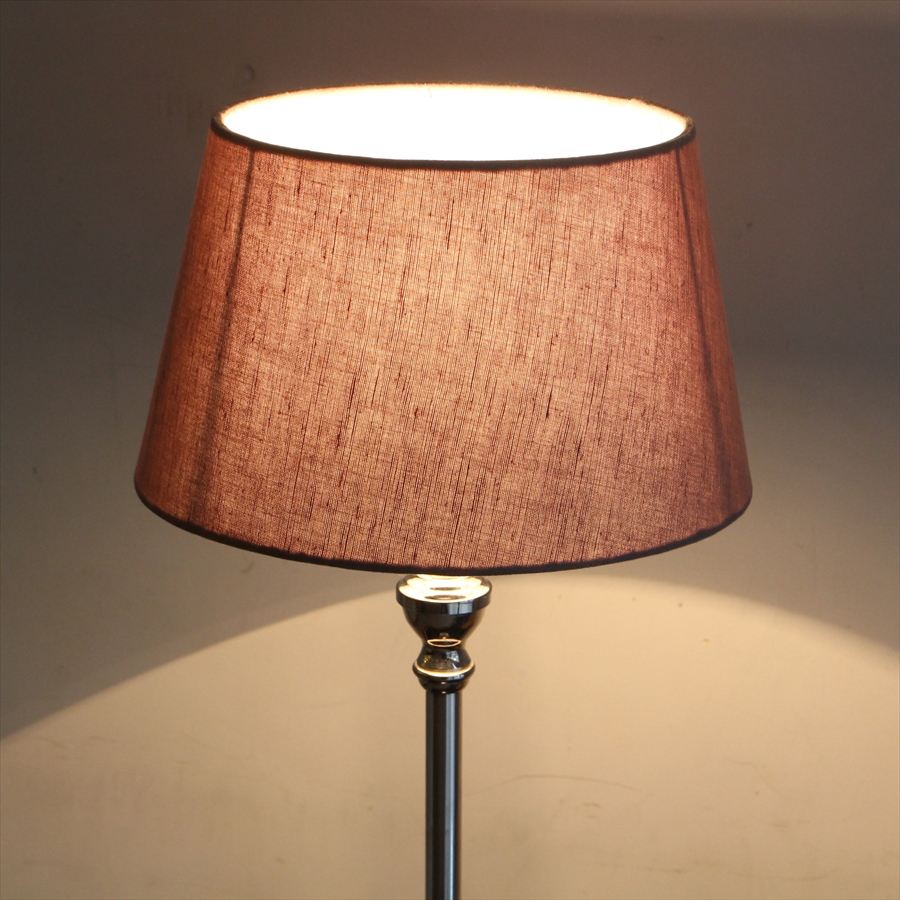 ボディはシルバーのメタル素材で、シェードはブラウングレーで透過性があり明るく光るタイプの布シェードスタンドランプです。どことなくゴージャスな雰囲気のスタンドランプです。土台はラウンドタイプ。