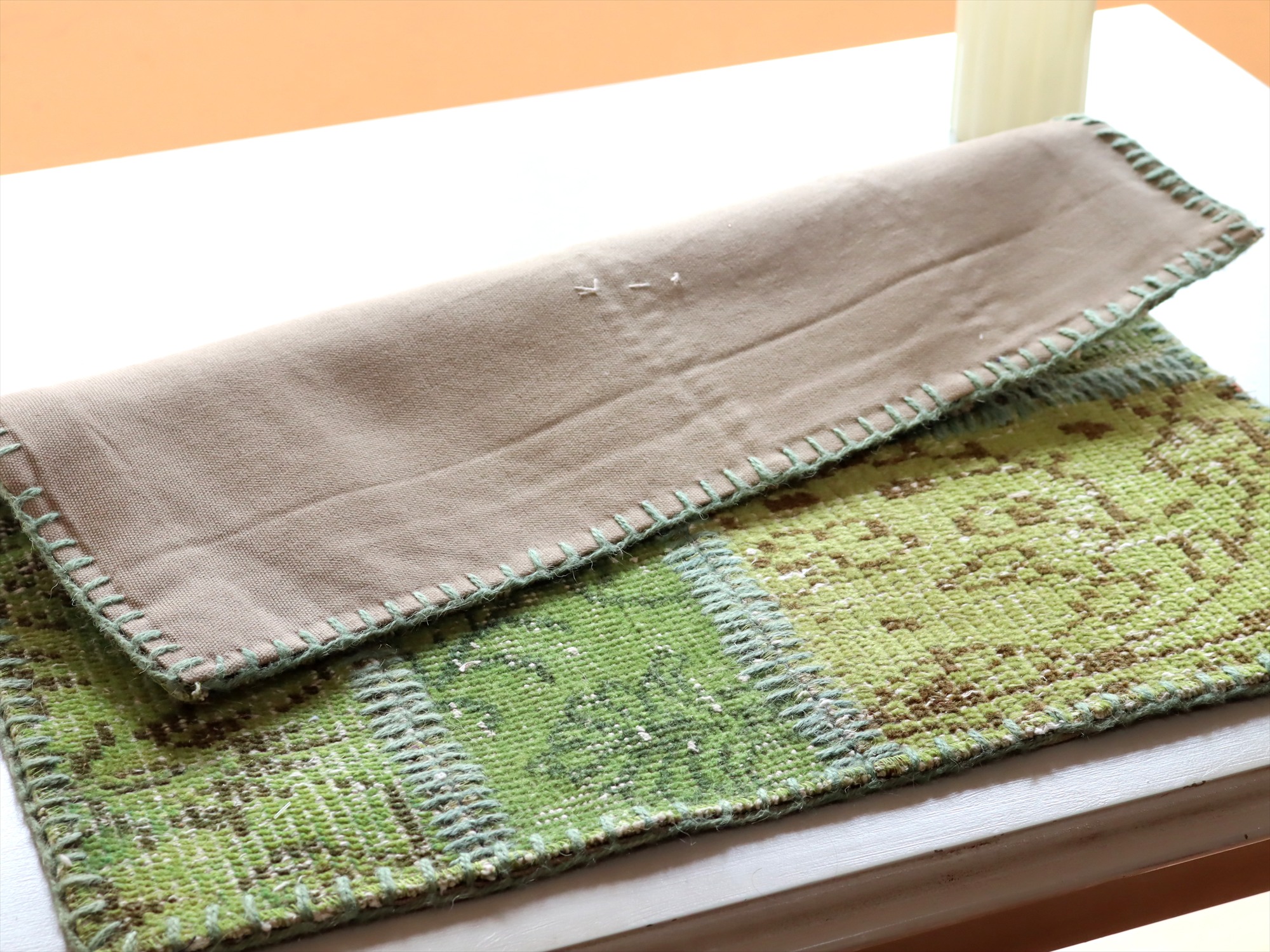 ダメージが多く、使われなくなった古い手織りカーペットを仕立て直したパッチワーク・ラグです。当店では、アナトリア(トルコ地方)のオールドカーペットのみを使い、縫い合わせ部分もミシンを使わず、手作業ではぎ合わせてあります。裏面にはコットン地が張り合わされています。ラグ(カーペット)自体は、パイル(毛足)が擦り減っているところなどが多々ありますが、使い古したラグならではの風合いとご理解ください。