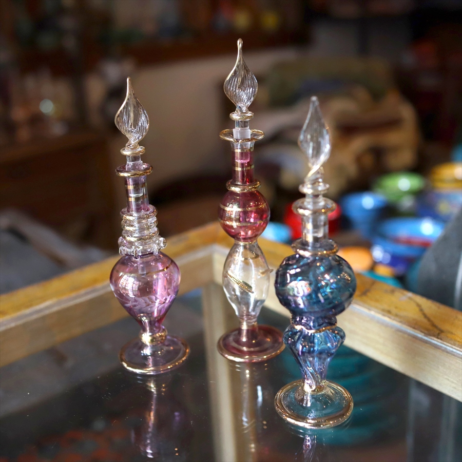アラビアンな輝きの香水瓶。約12cmの高さのミニサイズ3本セットです。エジプトのカイロにて職人さんが一つ一つ手作りで作っているので、カラーやデザインのバリエーションも様々です。