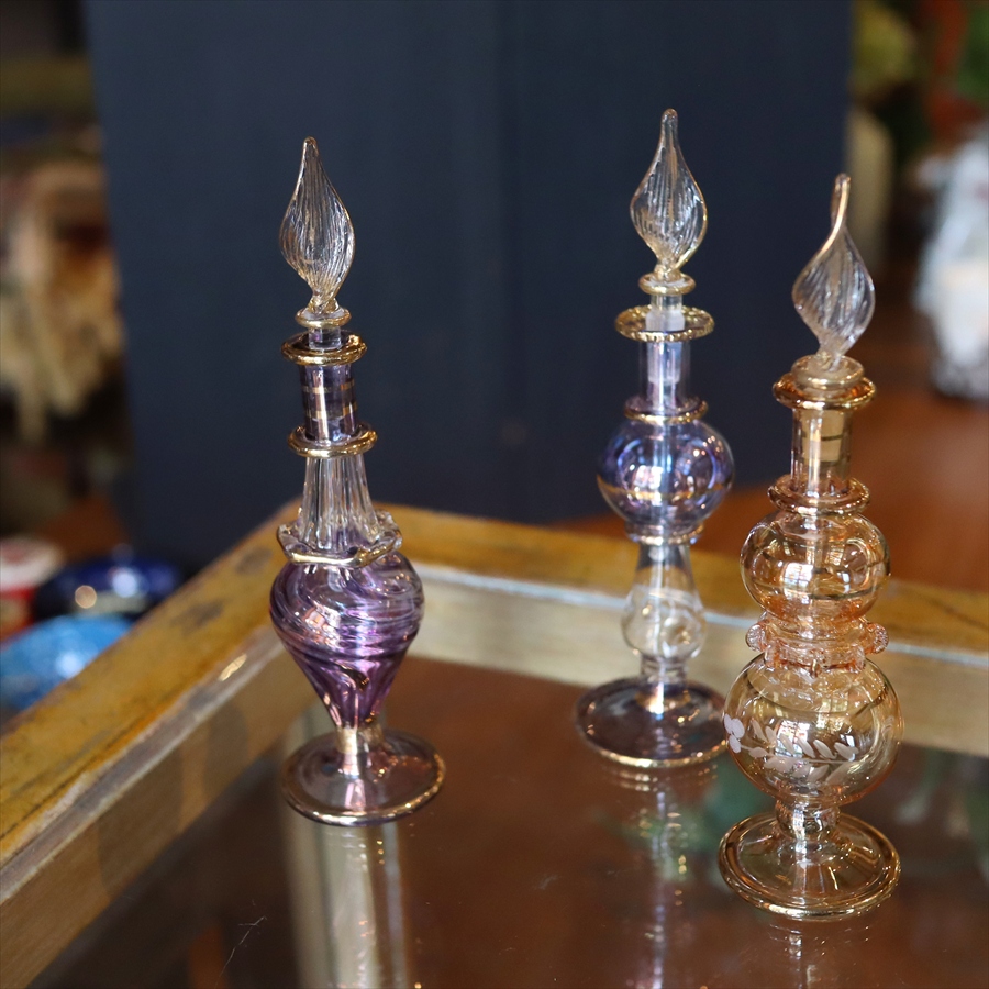 アラビアンな輝きの香水瓶。約12cmの高さのミニサイズ3本セットです。エジプトのカイロにて職人さんが一つ一つ手作りで作っているので、カラーやデザインのバリエーションも様々です。