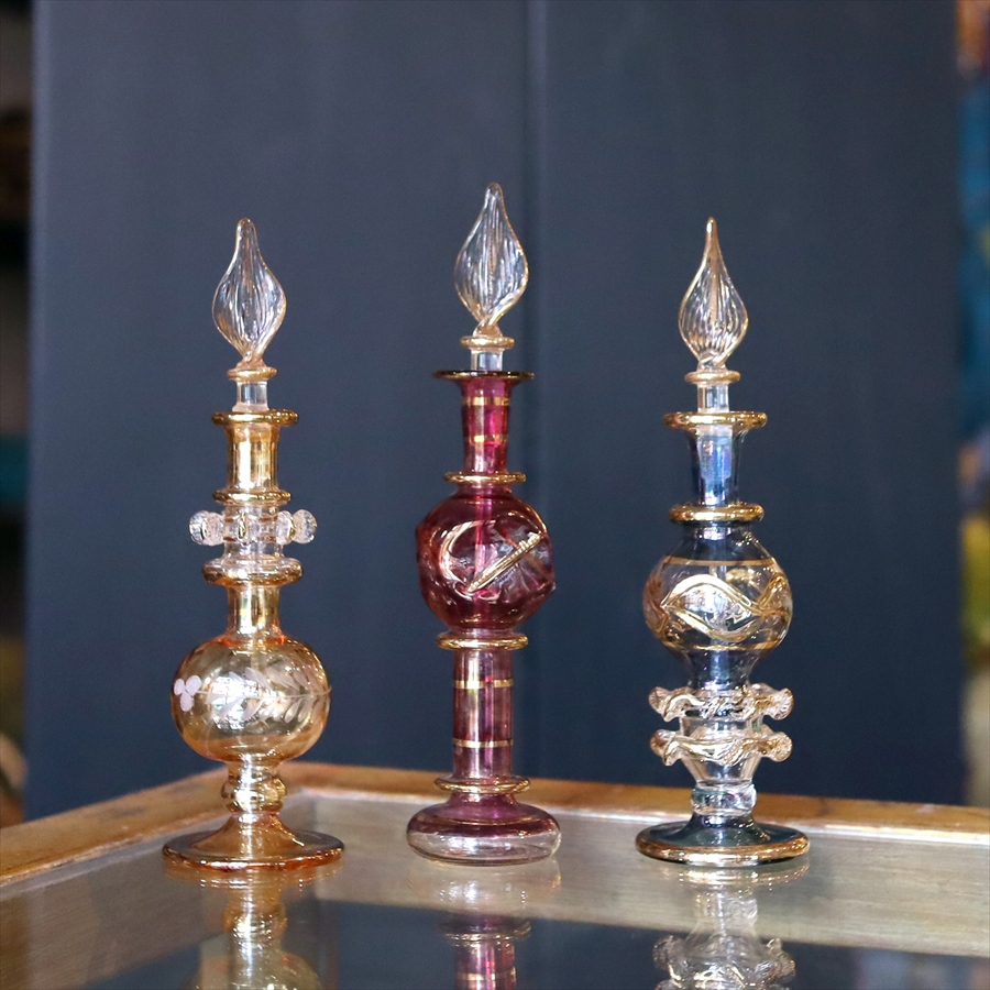 アラビアンな輝きの香水瓶。約12cmの高さのミニサイズ3本セットです。エジプトのカイロにて職人さんが一つ一つ手作りで作っているので、カラーやデザインのバリエーションも様々です。