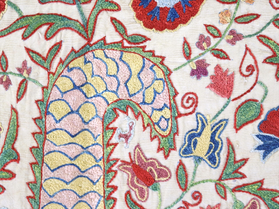【リプロダクション・スザンニ】中央アジア・ウズベキスタン共和国で作られたシルク糸の手刺繍布「スザンニ」。アンティークリプロダクションは、主に18世紀中ごろから19世紀末にかけて作られたスザンニのデザインを再現したもので、一時は途絶えてしまった伝統が、ソヴィエトから独立した1991年以降に再び取り戻され、現代に受け継がれているものです。